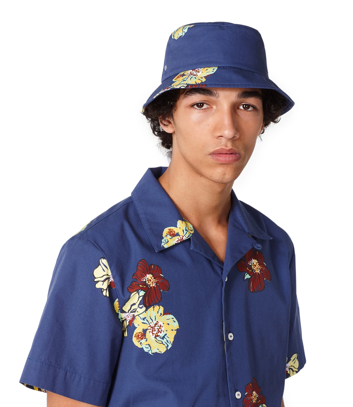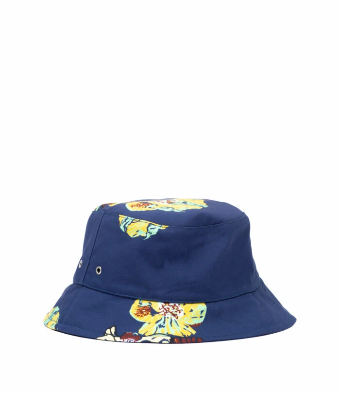 Light denim with six panels. Quilted umbrella and individual parts. Adjustable strap. Two metal eyelets on each side. Head circumference and individual parts reinforced inside with grosgrain ribbon. Embroidered APC logo on the contrasting stripe on the front. Bonded inner lining made of cotton. Sizes: 58 cm / 60 cm.
