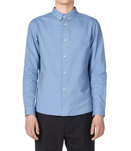 Portuguese cotton Oxford cloth. Button closure. Six buttons. Button-down collar with topstitched edges. Back yoke. Pleat and buttoned slit at wrist. Topstitched, buttoned cuffs. Felled seams. Narrow, slightly rounded hem. Mother-of-pearl buttons.