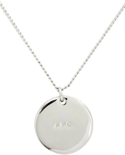 Chain link necklace in silver-tone brass. Logo-engraved pendant at drop. Logo disc at adjustable lobster clasp fastening. Approx. 22.5″ length. Supplier color: Silver Brass.