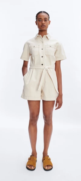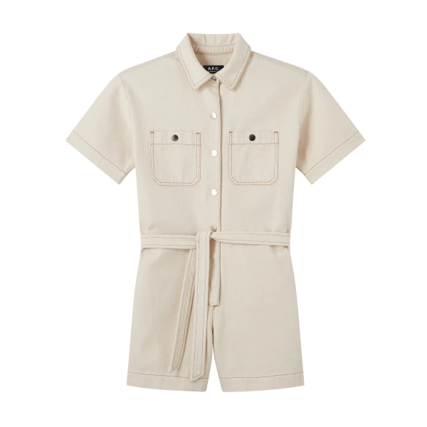 Short jumpsuit with belt to tie in cream. contrast stitching. Silver snaps. Short sleeves. side pockets. 100% cotton. Denim material. Made in Portugal.