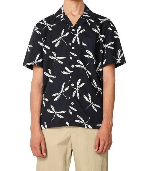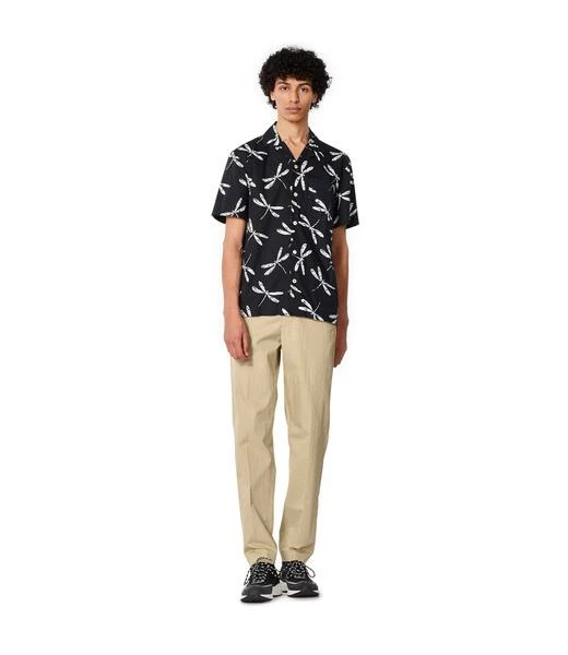 Poplin in dragonfly print. Straight cut. Open collar. Topstitched buttoned placket. Seven mother-of-pearl buttons. Pointed breast pocket. Short sleeves. Straight hem. Wide topstitched cuff and hem. 100% Cotton.