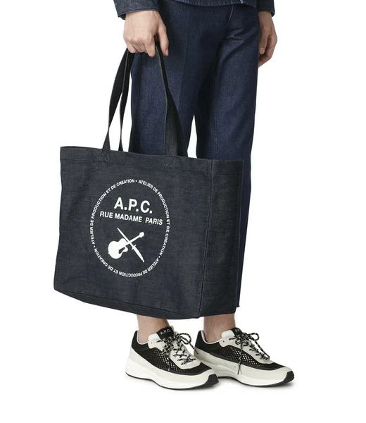 Japanese denim. Large topstitched hem at top of bag. Two handles with topstitched X. May be carried on shoulder or by hand. Long band, cut in a single piece, on sides and at bottom. Contrasting “Guitare Poignard” motif silkscreened on front. Interior pocket suspended at top from hem. T one-on-tone interior stitching. Dimensions: 44 x 36 x 14 cm.