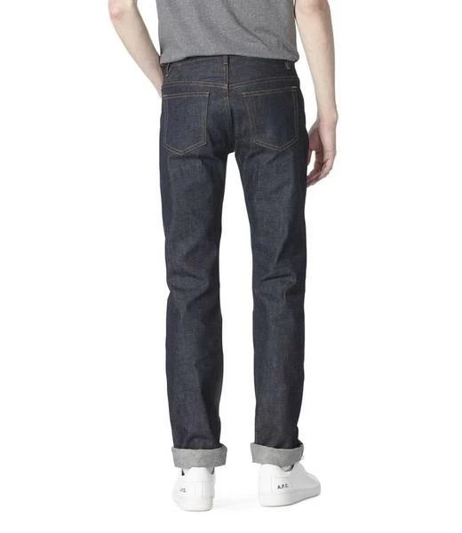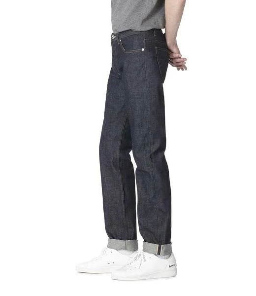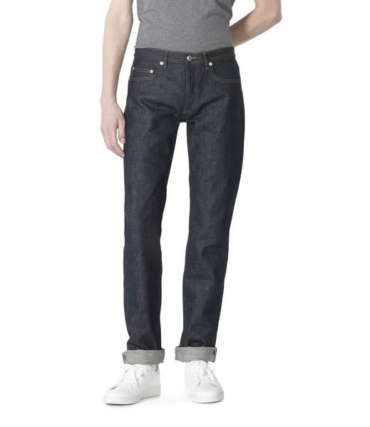 Japanese raw denim. Very stiff fabric that wears in over time. 100% Cotton. Straight leg. Straight mid-rise. Five pockets, button fly. The first button is engraved “A.P.C. rue Madame près du Luxembourg”. Interior of fabric trimmed with selvage over entire length. Orange topstitching. 14.50 oz. Machine wash. Do not tumble dry. Themodel is 6′ 1″ and is wearing size 30. Inseam all sizes: 33″
