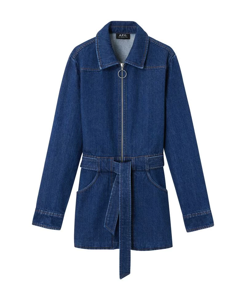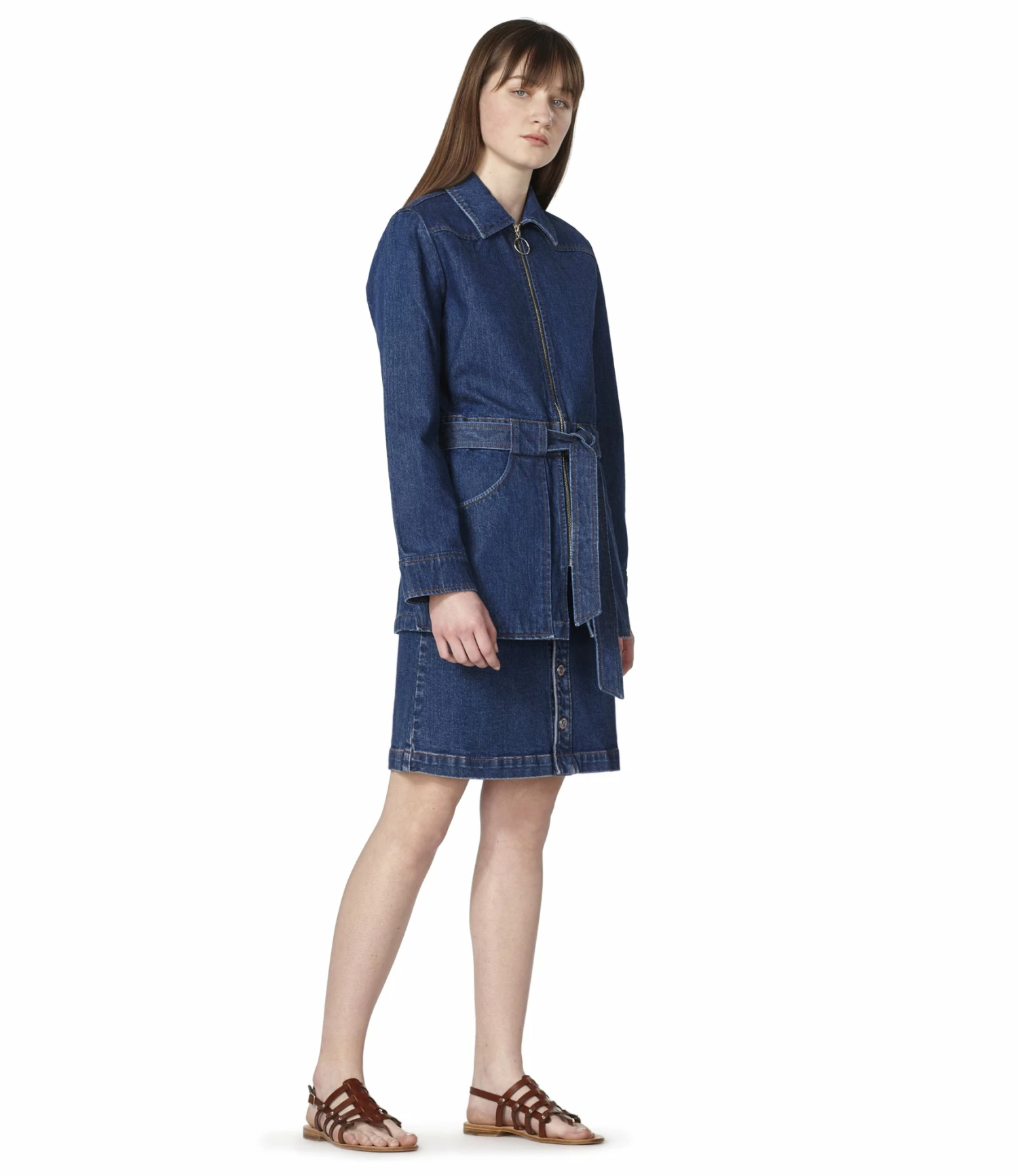 Weicher Denim. Japanisches Material. Straight Cut, Inspiration für einen Safari-Mantel. Klassischer Kragen. Reißverschluss mit abgerundetem Zug. Denim-Einsatz an Schultern und Taschen. Abgerundete Taschen. Passt sich in der Taille mit abnehmbarem Gürtel an. Ungefüttert.
