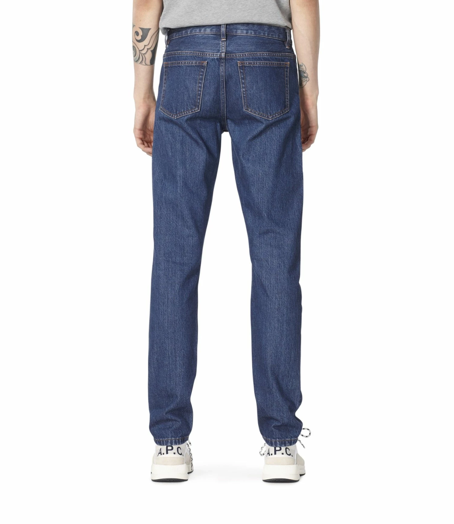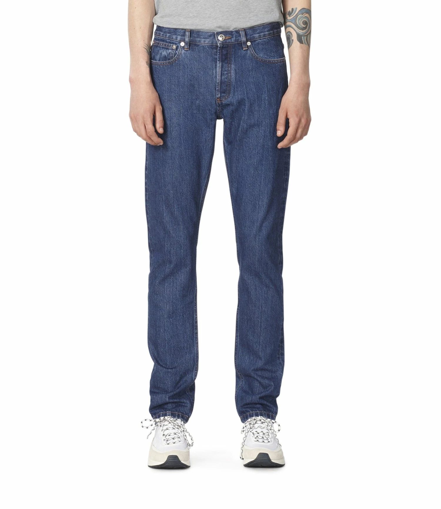 Leichter Denim aus Japan. Unisex Jeans. Sehr schmales Bein, enger Saum. Mittelhohe, gerade Taille. Knopfverschluss, erster Knopf mit «A.P.C. rue Madame près du Luxembourg» Gravur. Geprägte Metall-Nieten. Gleichfarbige Steppnähte.