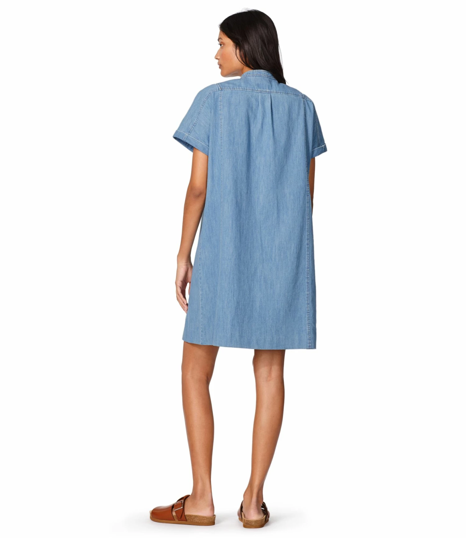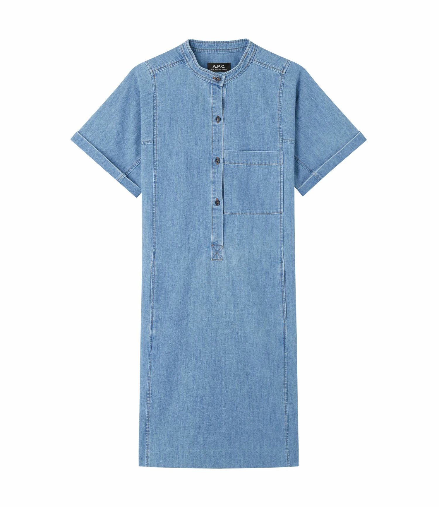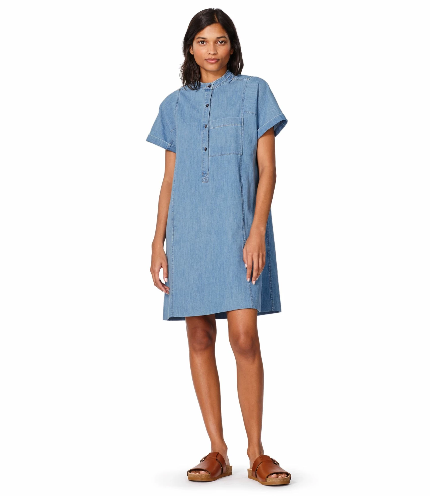 Feiner Denim aus Italien – Leichtes und fließendes Material. Gerade und weit geschnitten. Kleiner Stehkragen. Halbe Knopfleiste mit X-förmiger Steppnaht. In der Naht versteckte Taschen. Kontrastierende, aufgesetzte Brusttasche. Kurze Kimono-Ärmel. Überknielang.