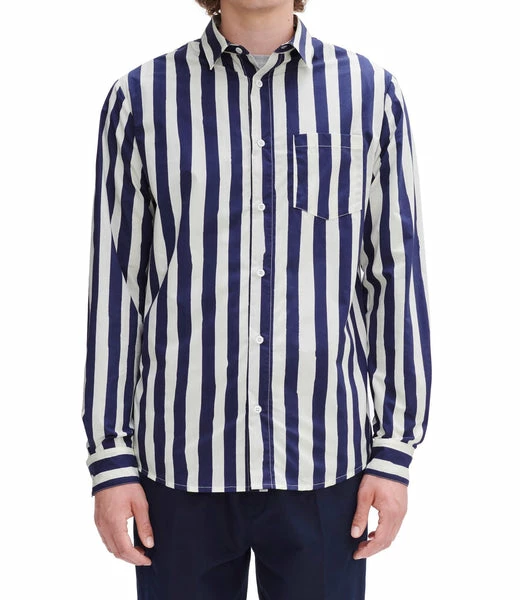 Straight-cut shirt in irregular blue and white stripes. Straight cut. Classic collar. Pocket over the heart. Exclusive A.P.C. striped motif. This model fits true to size; choose your usual size. 100% Cotton. Made in Tunisia. Machine wash 30° C recommended. Wash inside-out.