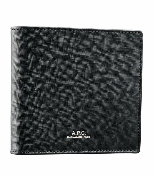 Slim wallet in embossed leather. Wallet in embossed leather. 2 banknote pockets. 4 card slots. 1 coin purse with snap flap. Small embossed ‘A.P.C. Rue Madame Paris’ logo. Cotton lining. Dimensions: 11 x 9.5 cm. Credit card format cardholder. 100% leather. Made in Morocco. In case of stains or rain, dry directly with a soft cloth and wash with soapy or micellar water. If the stains persist, apply a leather cream.