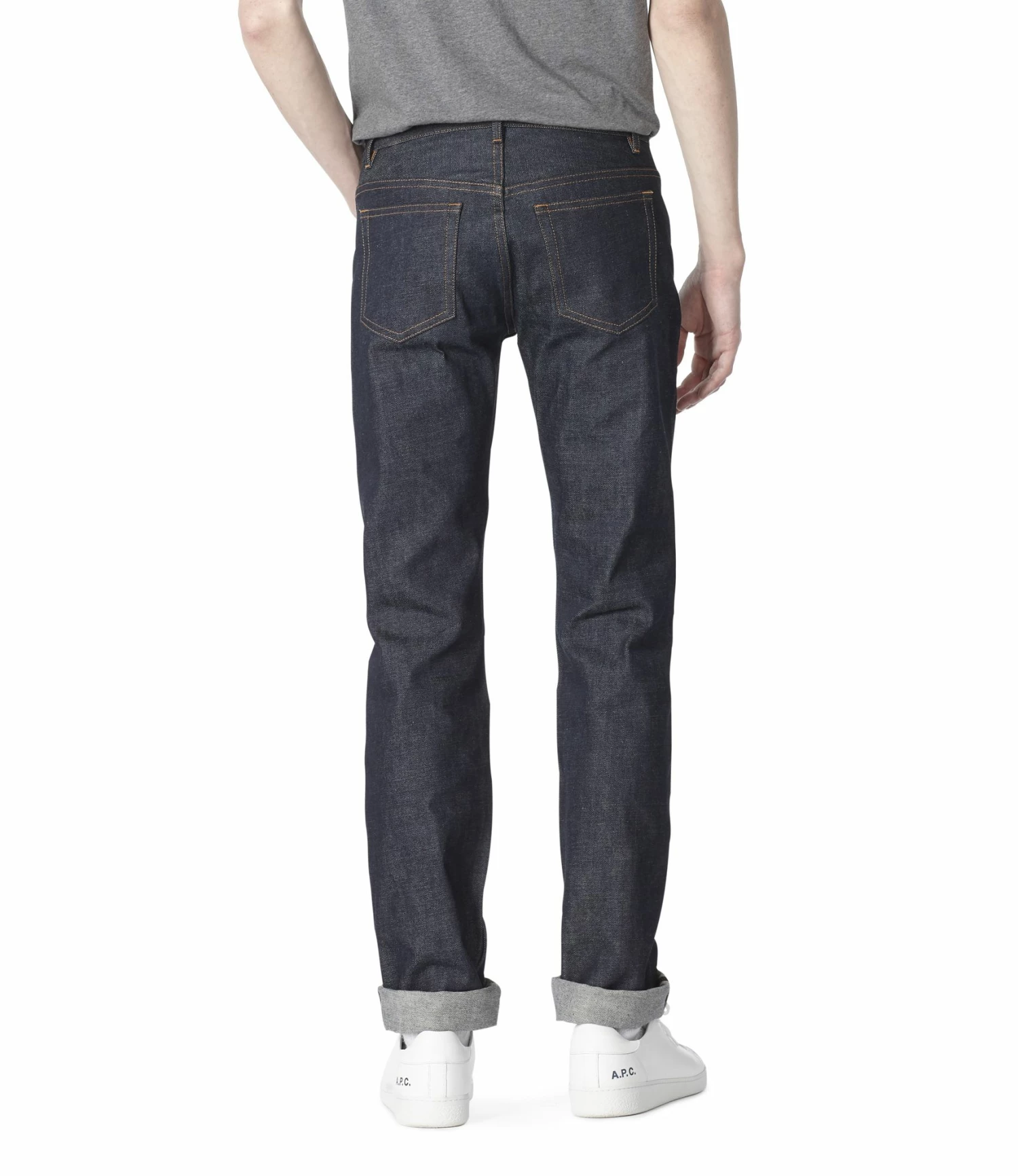 Ungewaschener japanischer Denim. Sehr steife Leinwand, die sich mit der Zeit abnutzt. Unisex Jeans. Gerade geschnitten. Gerade in der Mitte des Aufstiegs. Fünf Taschen, Knopfleiste. Der erste Knopf ist mit der Gravur ,,A.P.C. rue Madame près du Luxembourg. Kontrastierende karamellfarbene Absteppung. Selvage Jeans – Selvedge-Denim. Material: 100% Baumwolle.