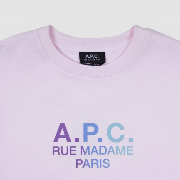 Classic logo sweatshirt from A.P.C. Long sleeve cotton sweatshirt in pink. · Elasticized rib knit crewneck collar, cuffs, and hem · Logo printed in tones of blue and purple at front Body: 100% cotton. Trim: 95% cotton, 5% elastane. Made in Portugal.