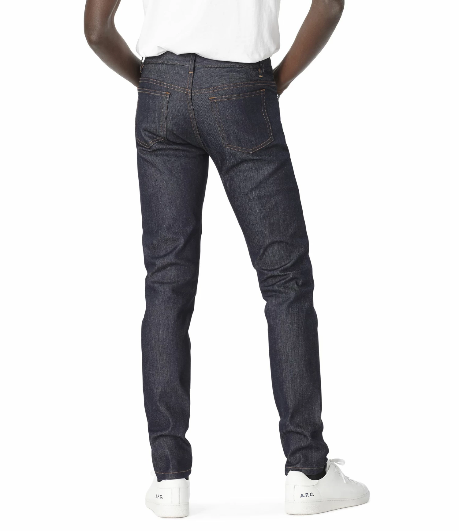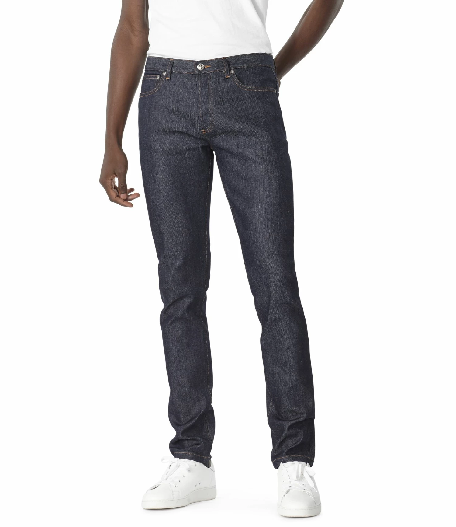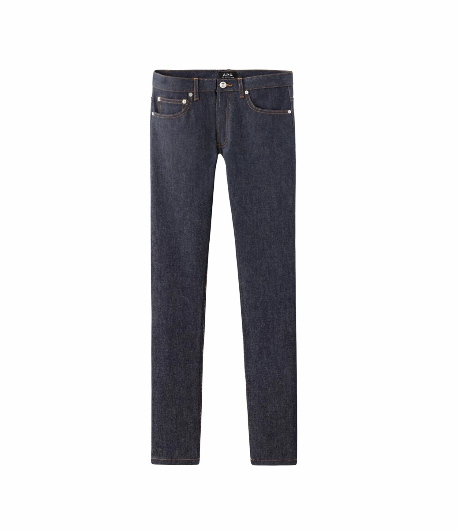 Japanischer Raw Stretch Denim. Unisex Jeans. Sehr enges Bein unten. Gerade in der Mitte des Aufstiegs. Fünf Taschen, Knopfleiste. Der erste Knopf ist mit der Gravur „A.P.C. rue Madame près du Luxembourg. Geprägte Metallnieten. Kontrastierende karamellfarbene Absteppung. Denim ohne Webkante. Material: 100% Baumwolle.