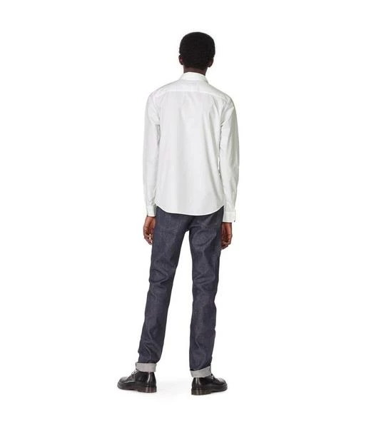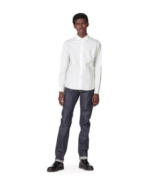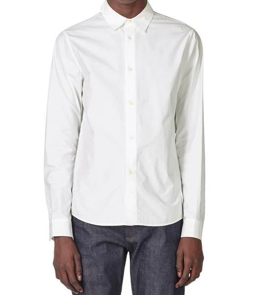 Italian cotton poplin. Small collar. Button closure without top-stitching. Seven buttons. Back yoke. Pleat and slit at wrist. Buttoned rounded cuff. Felled seams. Narrow, slightly rounded hem. Mother-of-pearl buttons. 100% Cotton