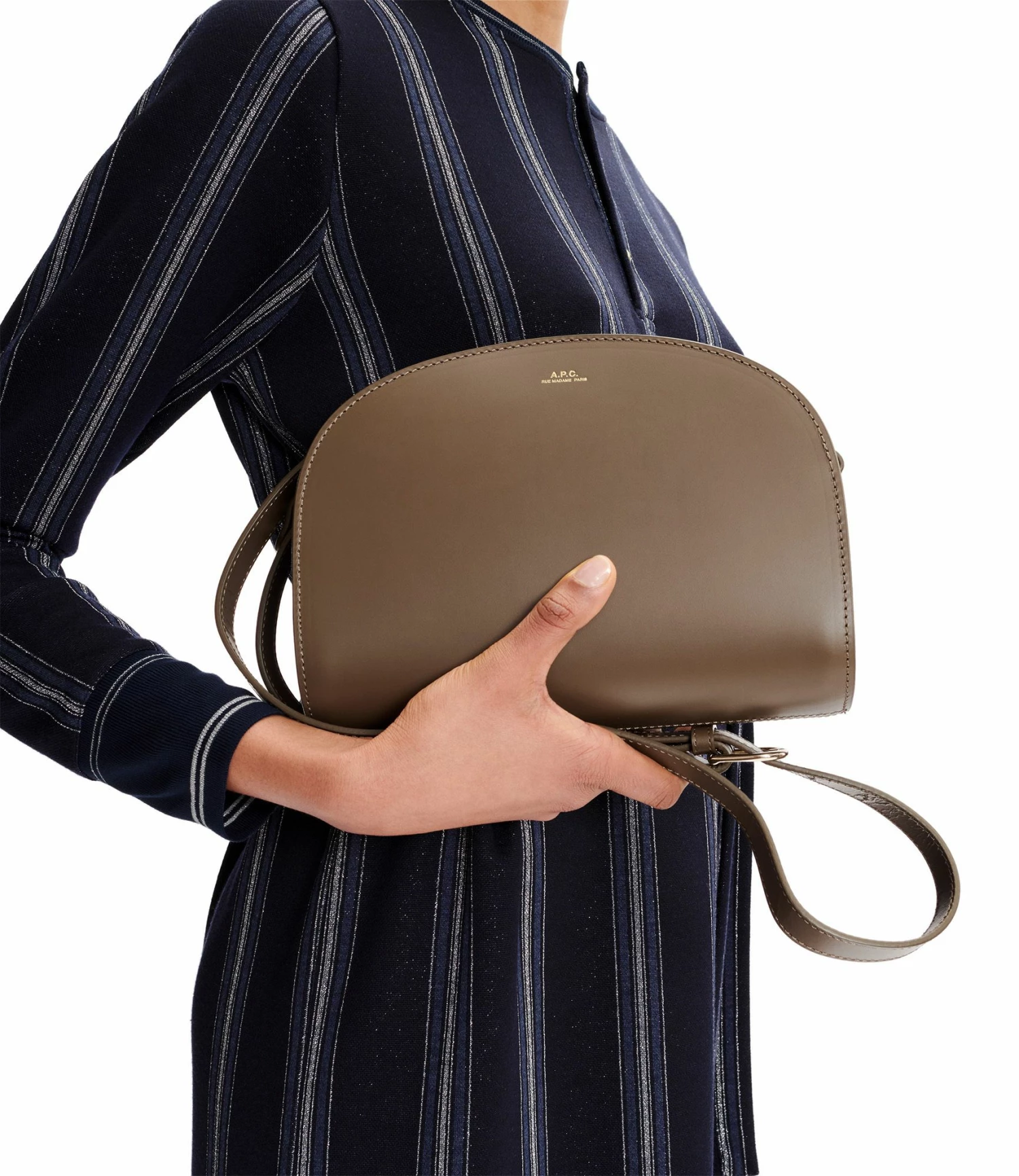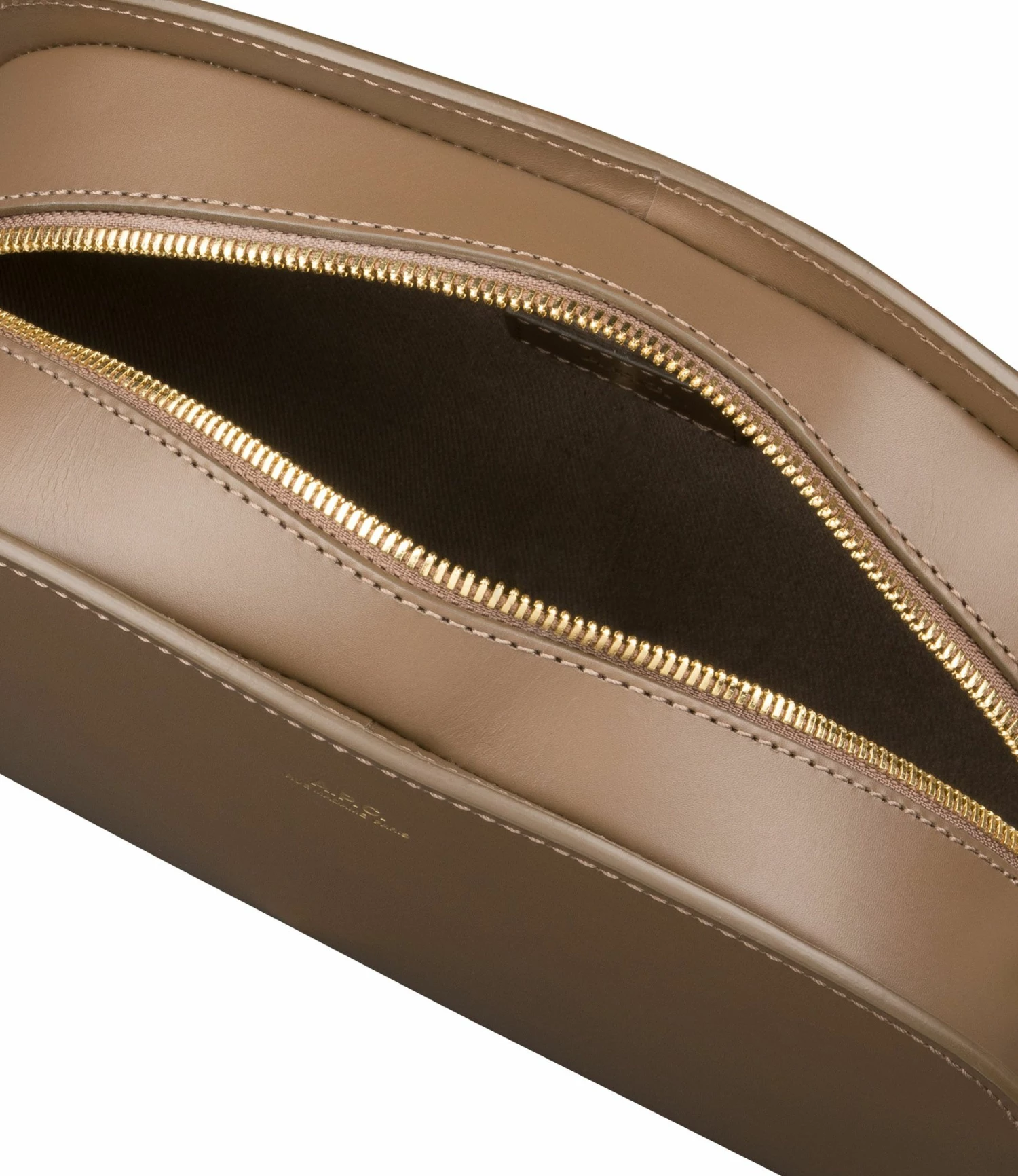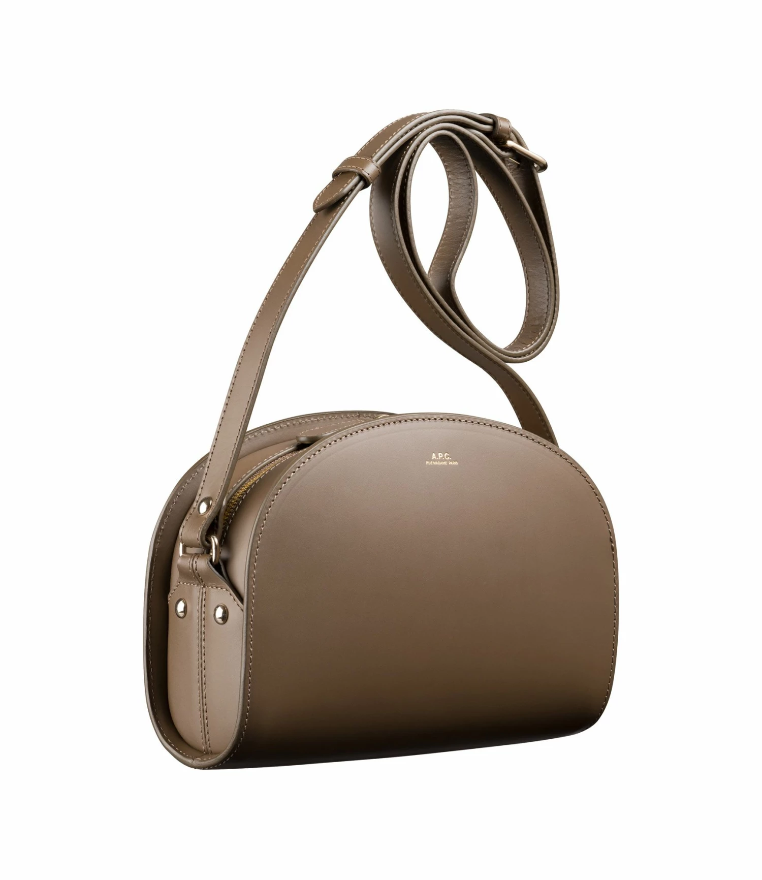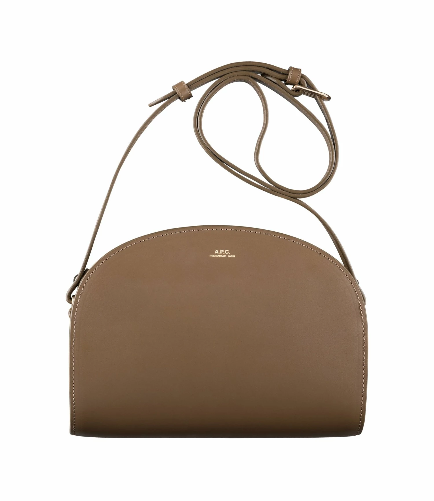 Kalbsglattleder. Vegetabil gegerbt, natürliche Patinierung vorgesehen. Doppelter Reißverschluss an der Oberseite. Schlaufen aus Leder. Mit einer Schlaufe verstellbarer Umhängeriemen. Über Kreuz oder an der Schulter zu tragen. Goldfarbenes “A.P.C. Rue Madame” Logo vorne eingestanzt. Gewölbte Nieten an den Seiten. Aufgesetzte Innentasche. Lederschild mit geprägtem A.P.C. Logo im Inneren. Gesteppte Kanten. Innenfutter aus Baumwollmischgewebe. Goldfarbene Beschläge. Verstellbarer Umhängeriemen: 53 cm.