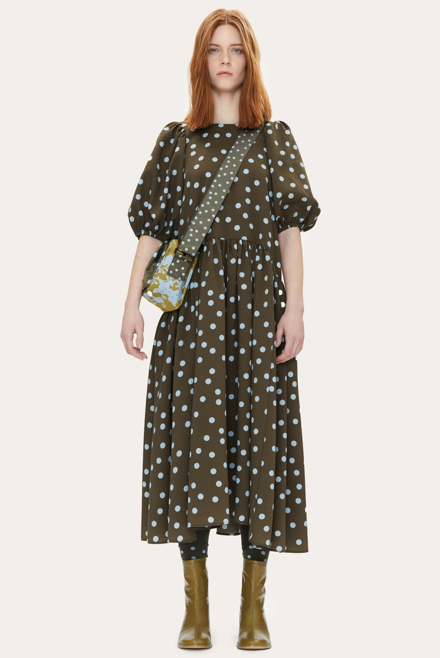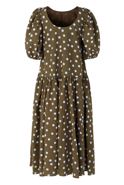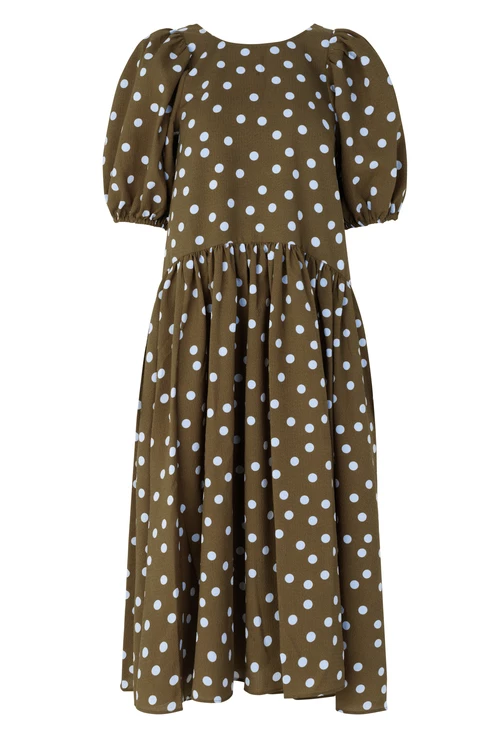 Amelia Dress in Blue Dots. Loose fitting mid length dress. Puffed short sleeves and hidden side pockets. Lightweight Recycled Polyester blend. Pair with Allison Boots in Cedar and the Lotta Bag in Flower Foliage Blue.
