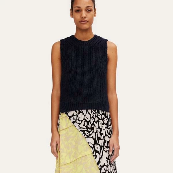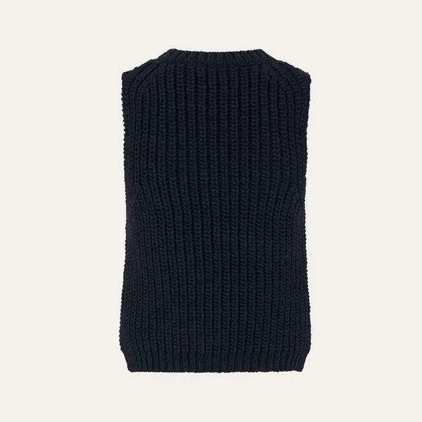 Stine Goya Annemarie Knit Vest in Navy. Pullover knit vest with mock turtleneck, form flattering knit contours and ribbed cuff on waistline. Made in Italy this is perfect for layering over a dress or white blouse. 10% alpaca/15% wool/75% acrylicHand washMade in Italy model is 177 cm tall and wears a size xs. Measurements for size small Chest 76 cm Bottom width 68 cm Full length 50 cm For the Autumn/Winter 2021 collection, Stine Goya draws inspiration from speakeasies of the roaring 1920s and the nonchalant cool of the 1980s New Romantics movement, where individuality and self-expression reign supreme. Driven by emotion and romanticism, GRUNGE EUPHORIA celebrates the carefree sensuality of nightlife.