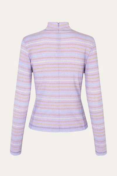 Ari Blouse in Ballet Stripe. Fitted lightweight long sleeve top with zip up turtleneck. Subtle striped pattern. 95% polyester/5% elastaneMachine wash