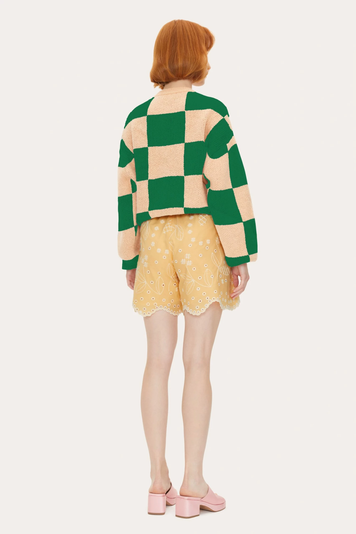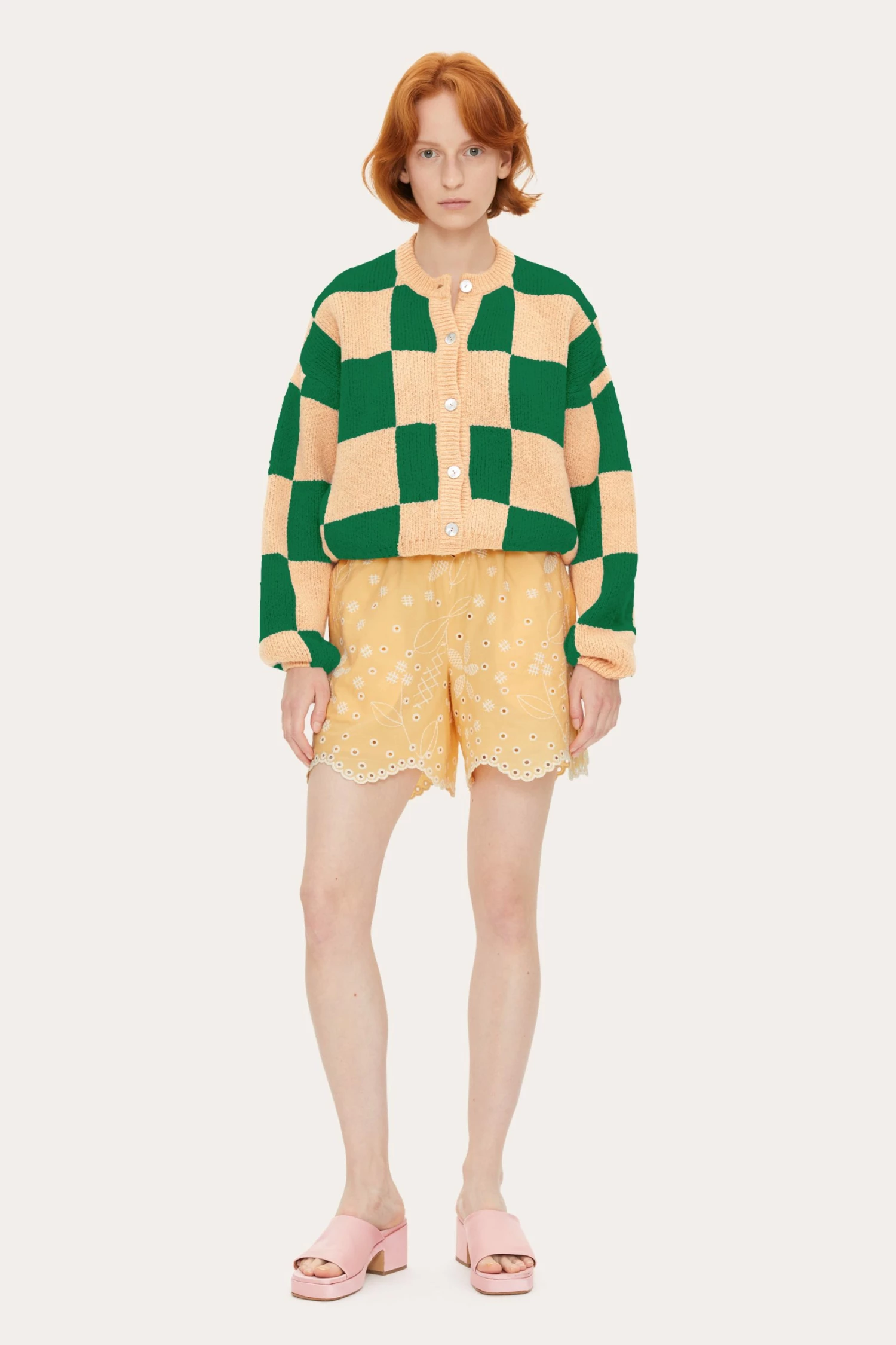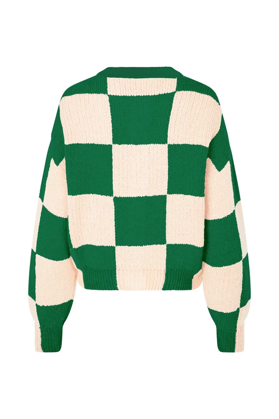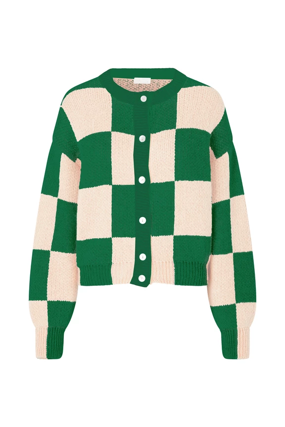 Ash Cardigan in Green Cream Melange. Button up knit sweater with simple checked pattern, ribbed hems and oversized long sleeves with cuffs.