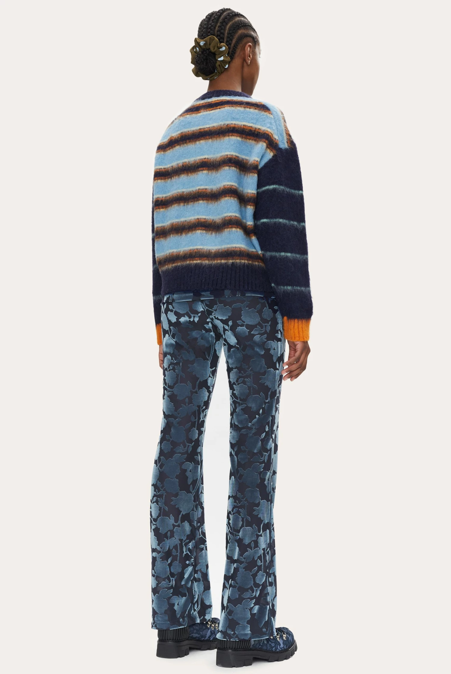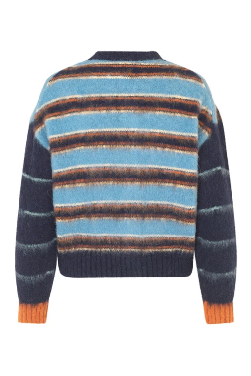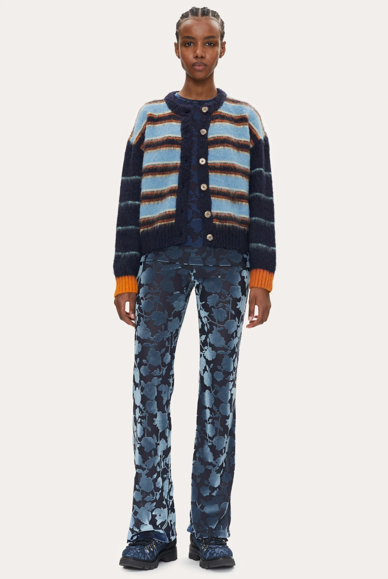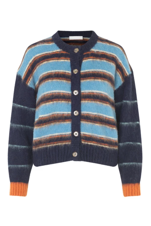 Ash Knit Cardigan in Stripes Multi. Relaxed fit button down cardigan with long sleeves. Colour blocked pattern and glitter button detailing. Layer over your favourite look from the collection.