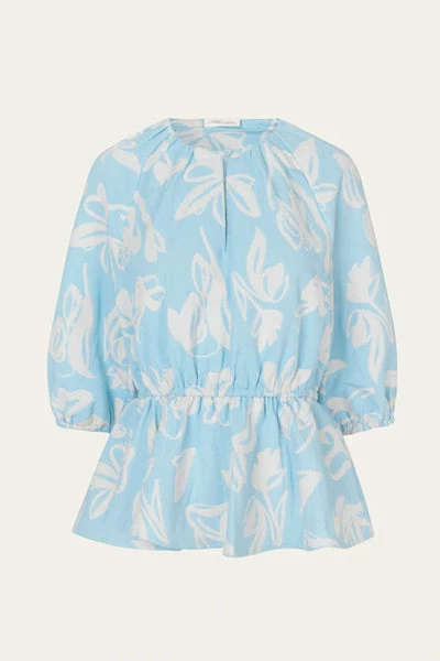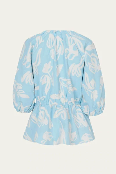 Britney Top in The Life of a Tulip Blue. Simple peplum blouse with mid-length voluminous cuffed sleeves and a V-neck with button fastening. Pair with the Isra Pants in The Life of a Tulip Blue. Jiao is 178 cm tall and wears a size XS. Measurements for size small: Chest 110 cm Bottom width 168 cm Sleeve length 49 cm Full length 66 cm 52% Polyester, 43% Cotton, 5% Elastane Machine Wash Made in Turkey For the Spring/Summer 2022 collection, Stine Goya offers an unapologetic space to honour creative communities and pay homage to the iconic Bloomsbury Group. How Much Can We Grow is imbued with modern silhouettes, intricate patterns, and a forward-thinking vision of the power wielded from unity.