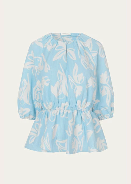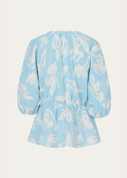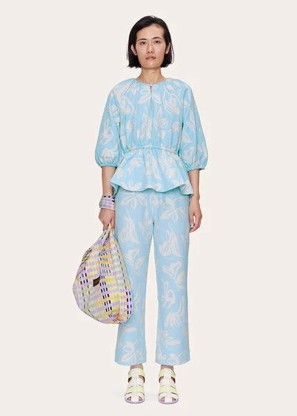 STINE GOYA Britney Top – The Life of a Tulip Blue Britney Top in The Life of a Tulip Blue. Simple peplum blouse with mid-length voluminous cuffed sleeves and a V-neck with button fastening. Pair with the Isra Pants in The Life of a Tulip Blue. Jiao is 178 cm tall and wears a size xs. Measurements for size small: Chest 110 cm Bottom width 168 cm Sleeve length 49 cm Full length 66 cm 52% Polyester/43% Cotton/5% Elastane Machine wash Made in Turkey Style ref: SG4086