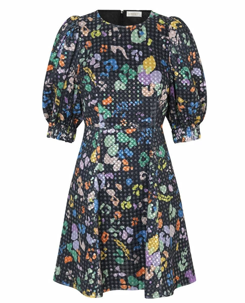 Stine Goya Celina Black Leopard Dress, a black mini dress with elbow length puffed sleeves and a round neck. Covered in a multi-coloured animal print and shimmering black sequins the Celina party dress has a defined waist and a short flared skirt. 100% Polyester Hand wash Model is 176cm and wears size XS – UK8 Measurements for size small: Chest 94 cm Bottom width 170 cm Sleeve length 45 cm Full length 93 cm XS – UK8, S – UK10, M – UK12, L – UK14 Stine Goya is very generously sized so we would recommend sizing down.