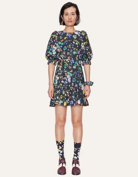 – Short sequin dress – Flared skirt – Elbow length voluminous cuffed sleeves – Patterned sequined material – Fully lined – Black leopard – 100% Polyester – STINE GOYA RD Size: M