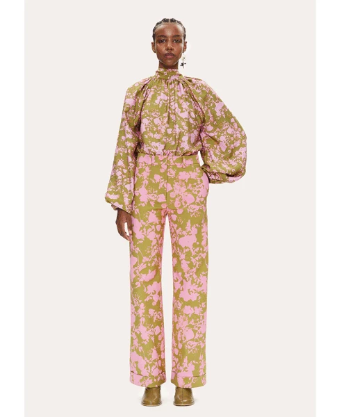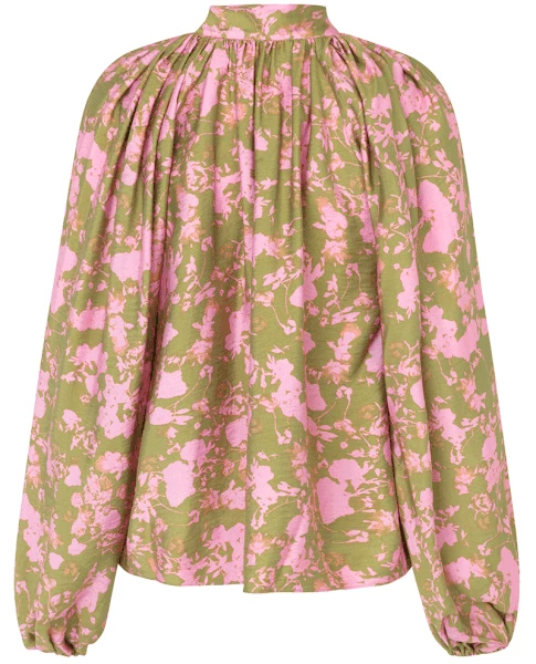 Stine Goya Corinne Foliage Top, a pink and green floral print blouse with a high neck and long billowing sleeves. Tying at the neck with an exaggerated bow this loose fitting top has elasticated cuffs. Wear with skinny jeans to offset the oversized fit or pair with leather trousers for the party season. Loose and floaty High neck Long voluminous sleeves Pussy bow neck tie Pink and green print 88% Modal & 12% Polyamide Hand wash Model is 174cm and wears size XS – UK8 XS – UK8, S – UK10, M – UK12, L – UK14 Stine Goya is a generously sized brand so please size down if between sizes or if you are petite.
