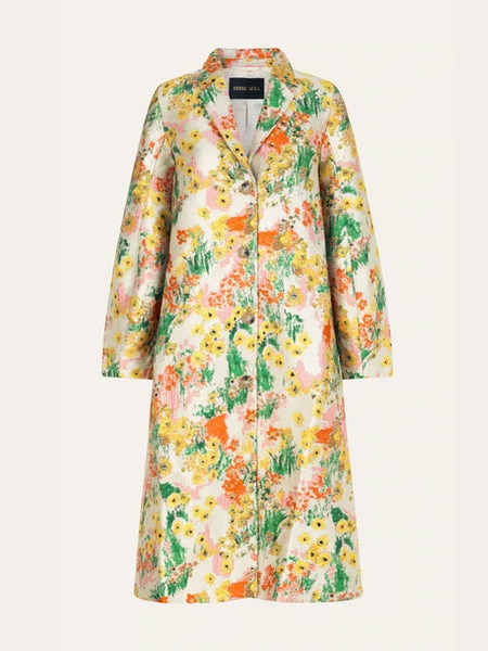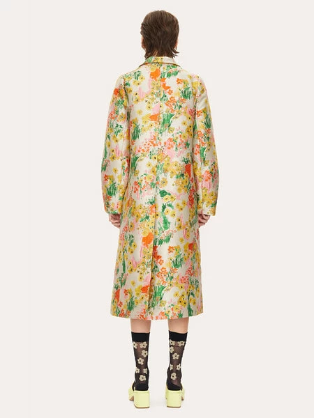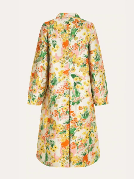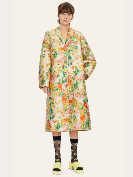 Made from a dazzling floral metallic jacquard, the Cornelia Coat by Stine Goya is a perfect layer for a smart occasion. This long-line coat presents a pointed collar with lapels, a button closure, side pockets, a back split and an a-line silhouette. Style over dresses and heels for smart ensemble. Pointed collar with lapel Button closure Side pockets Long-line silhouette A-line Back split Fully lined Floral pattern Metallic thread detail Composition: 54.6% Recycled Polyester, 22% Polyester, 12.2% Metallic, 11.2% Polyamide. Lining: 100% Recycled Polyester. Care: Do not wash. Dry Clean only.
