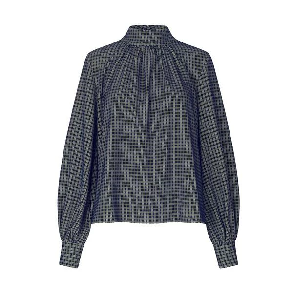 Eddy Top in Grid. Designed in the navy and bright green grid print, this style features balloon sleeves with buttoned cuffs, a small stand collar and a loose fit. Crafted from 100% recycled polyester. Small loop closure at back. Composition: 57% polyester/40% polyester/3% elastane Care: Wash 30 gentle Measurements for size small: Chest 110 cm Bottom width 118 cm Sleeve length 67 cm Full length 63 cm