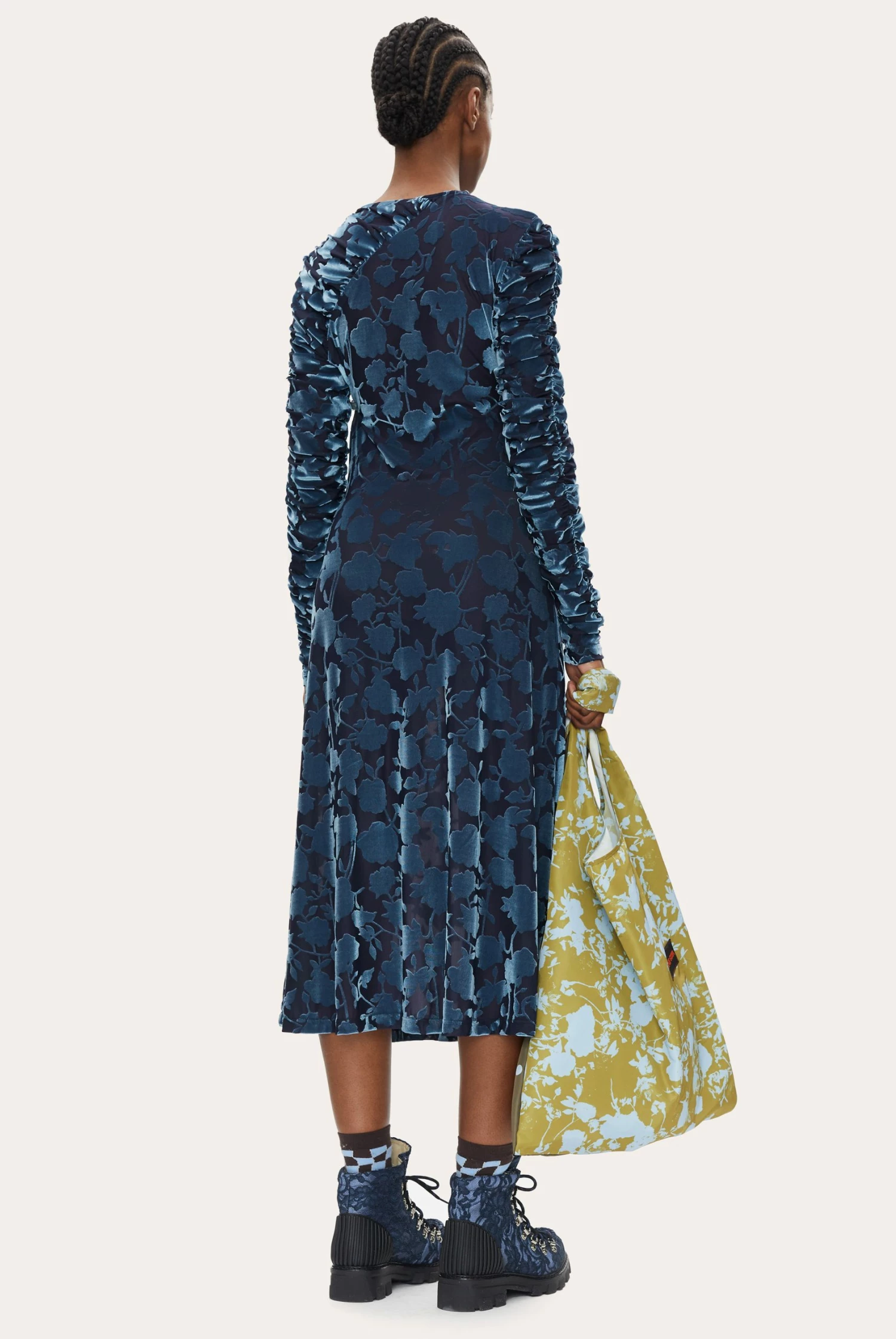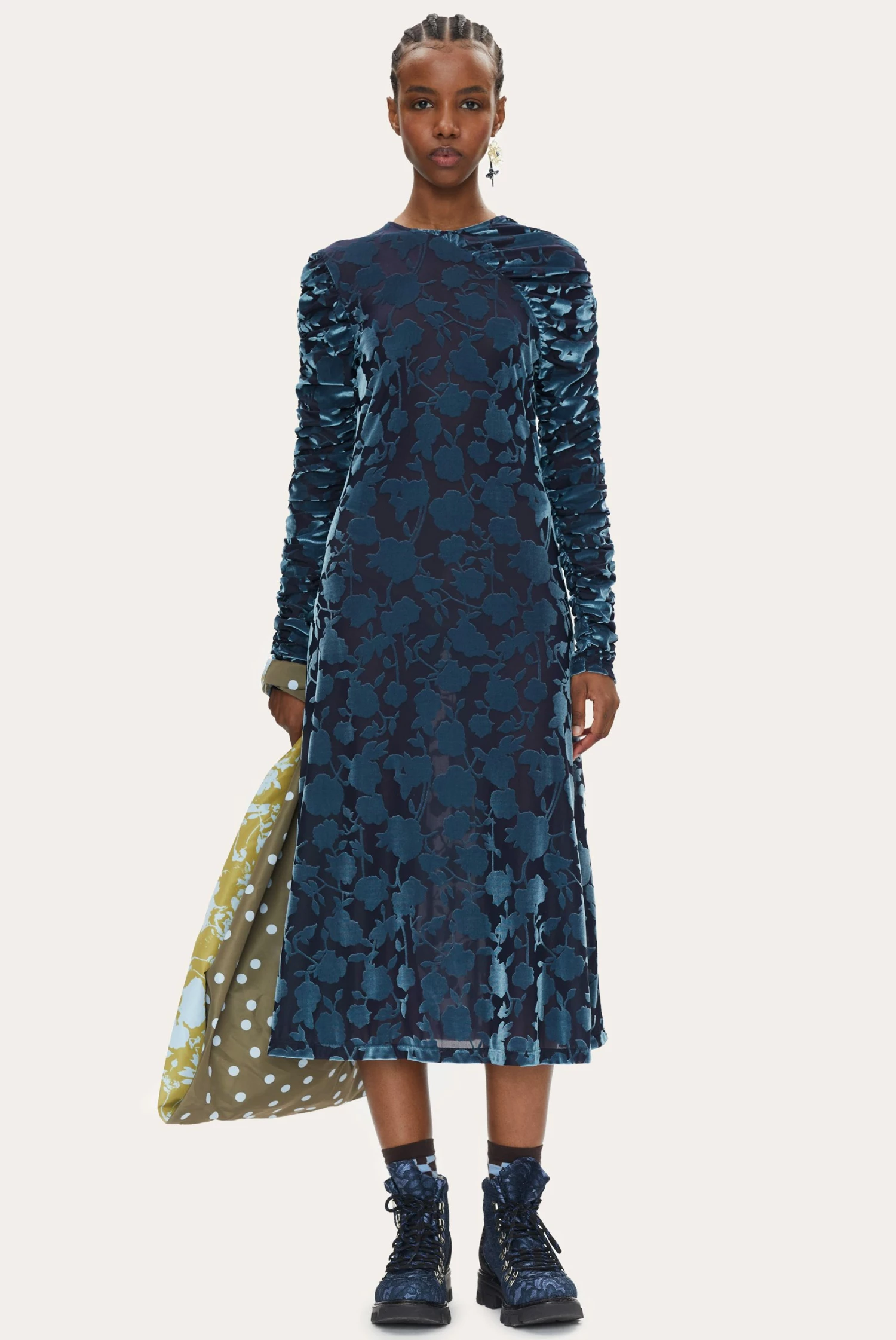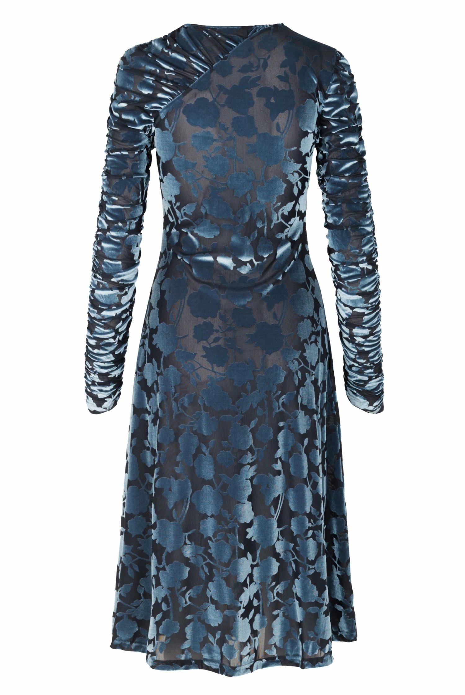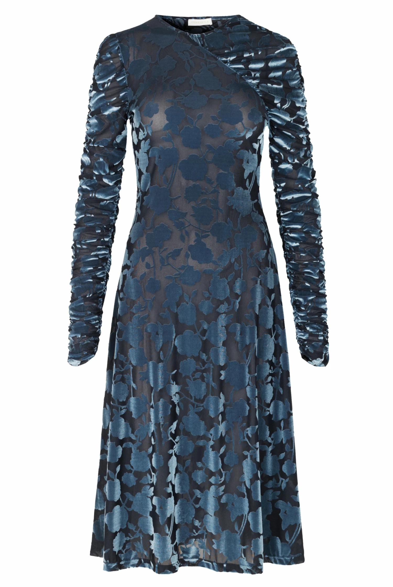 Ellie Dress in Flower Foliage. A-line dress with ruched long sleeves and wrap effect. Detailed with velvety semi-transparent lace pattern.