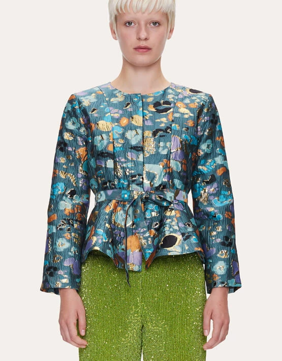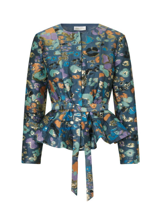 – Peplum jacket / top – Tie belt – Hook and eye front fastenings – Structured sheened material with intricate metallic pattern – Fully lined – Blue leopard – 75% Polyester, 12% Metallic, 13% Polyamide – STINE GOYA RD Size: XS