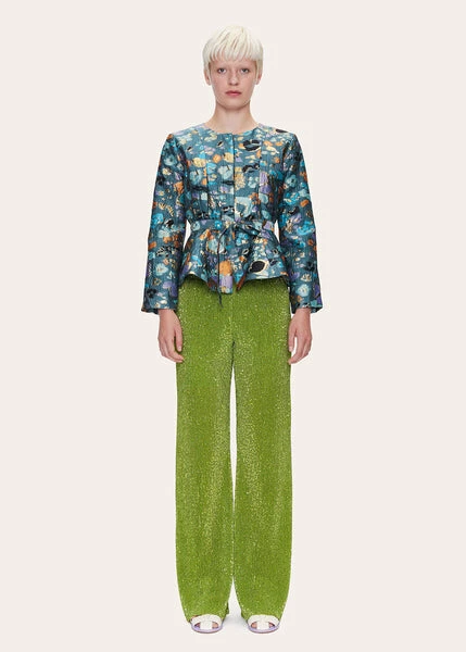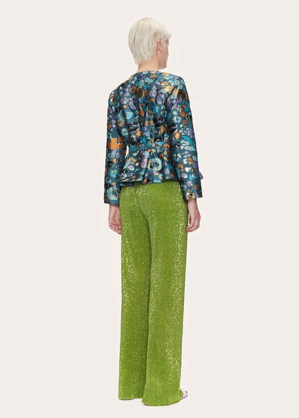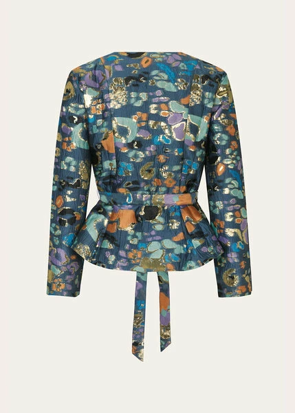 STINE GOYA Farahi Top – Blue Leopard Farahi Top in Blue Leopard. Button up long sleeved peplum top with tie belt. Structured sheened material with intricate metallic pattern. Fully lined. Pair with the Markus Pants in Lime Glitter. Vega is 176 cm tall and wears a size xs. Measurements for size small: Chest 98 cm Bottom width 166 cm Sleeve length 58 cm Full length 61 cm 75% Polyester/12% Metallic/13% Polyamide Hand wash Style ref: SG4072 Blue Leopard