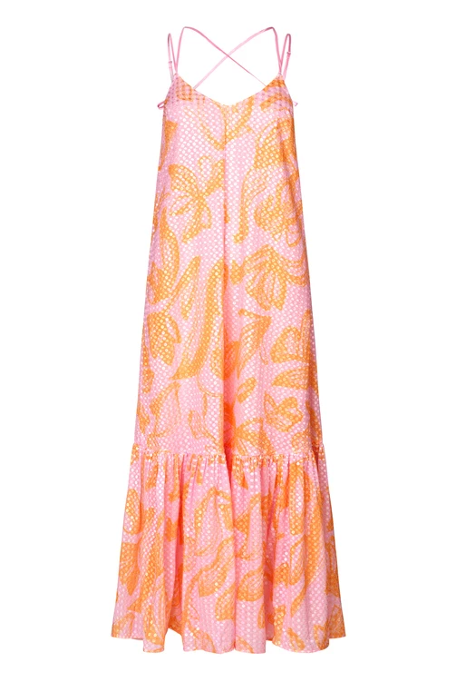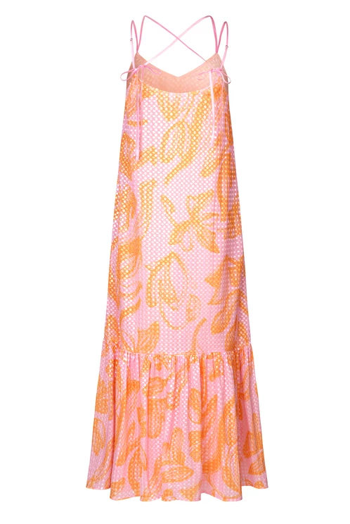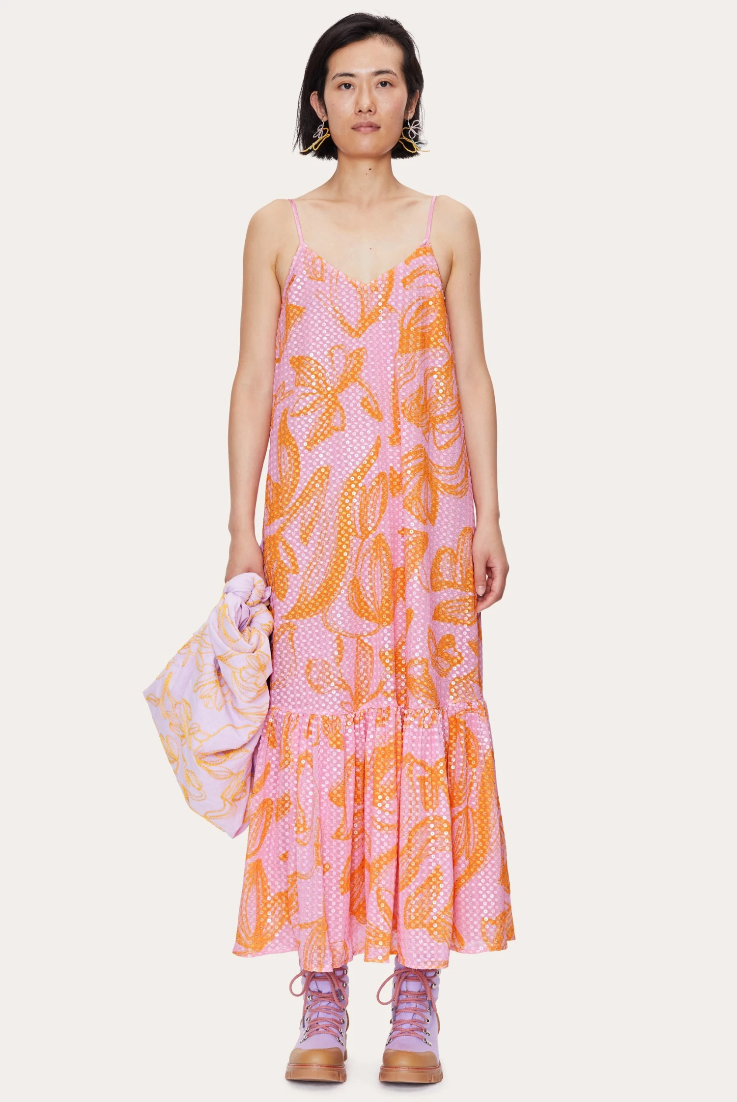 Francisca Dress in Stroke Flower. Single tiered maxi dress. Adjustable tie shoulder straps, elegant sequined fabric and hidden side pockets. Fully lined.