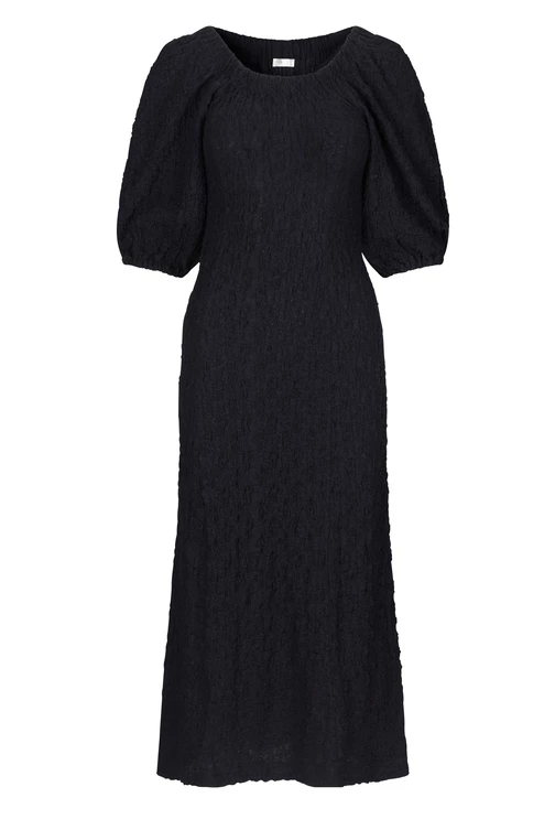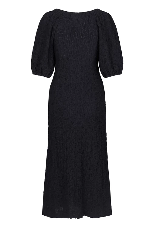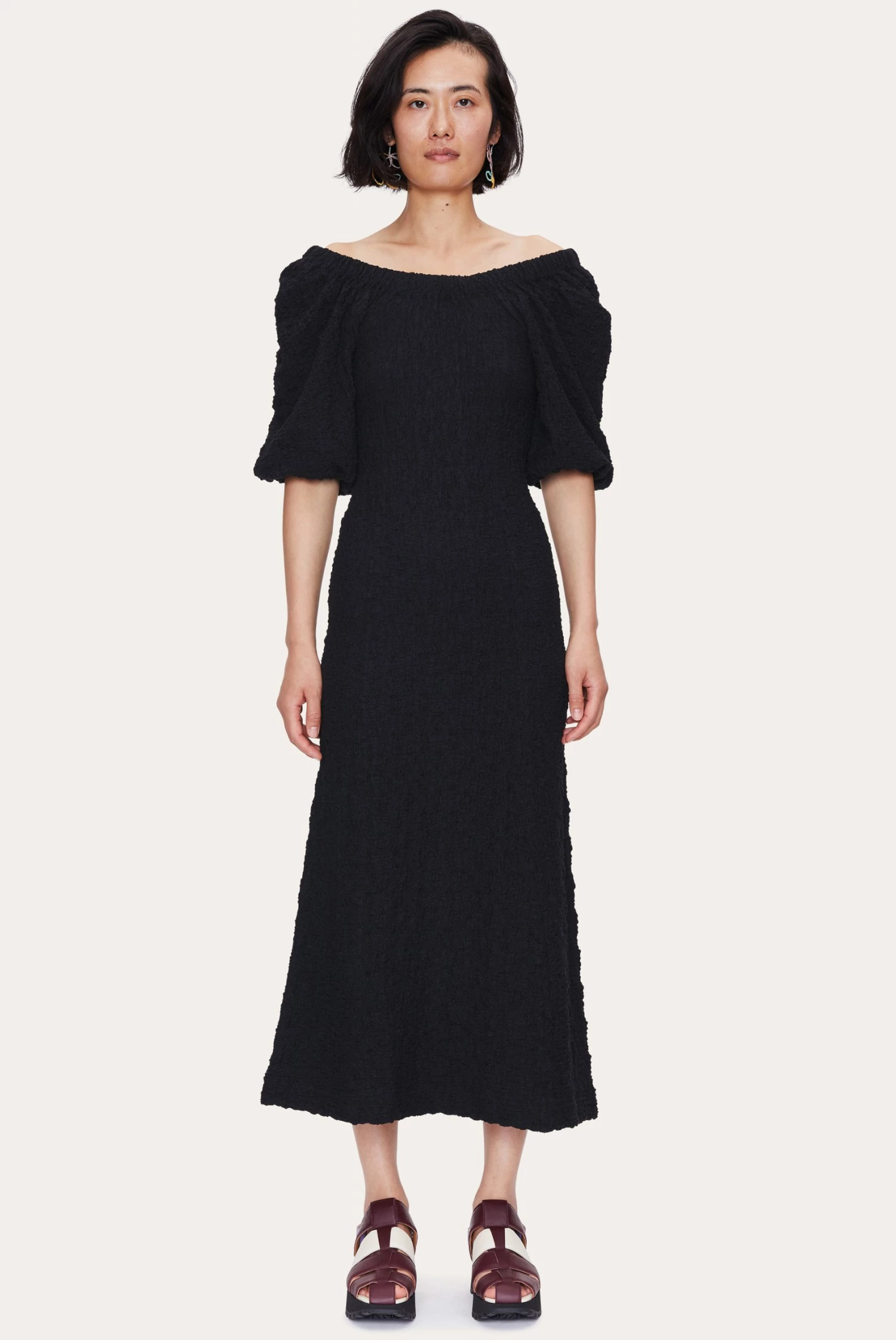 Garance Dress in Black. Slim midi dress with voluminous cuffed 1/2 length sleeves. Elasticated neckline for off-the-shoulder or boat neckline.