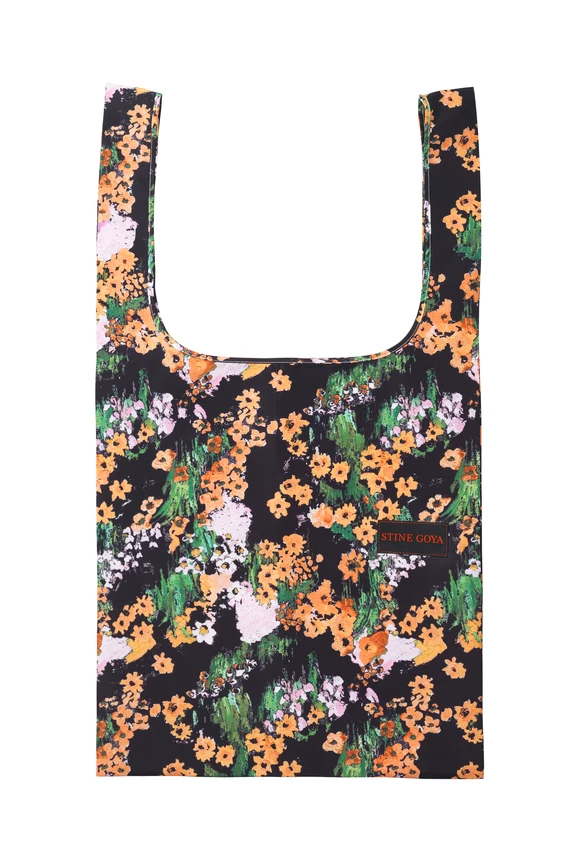 Idunn Bag in Artist Canvas at Night. Classic Nylon tote with hand drawn floral pattern and STINE GOYA logo patch. Recycled Polyester blend.