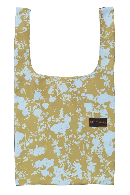 Idunn Bag in Flower Foliage Blue. Simple nylon tote bag with all over floral print. Rubber STINE GOYA logo patch. Made of Recycled Polyester blend.