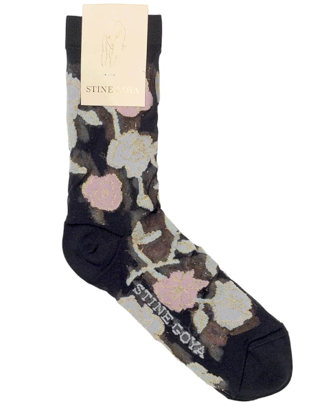 Stine Goya Iggy Flowers Socks, a floral ankle sock crafted from fine and semi sheer black polyester. 100% Polyamide Hand wash Fits size 36-41