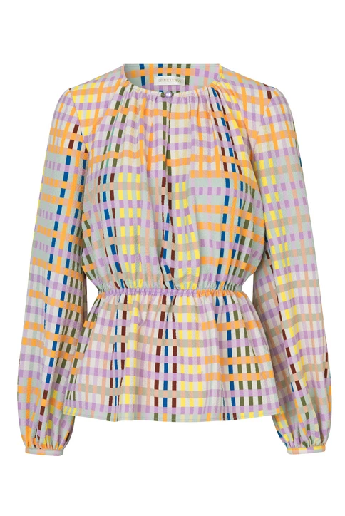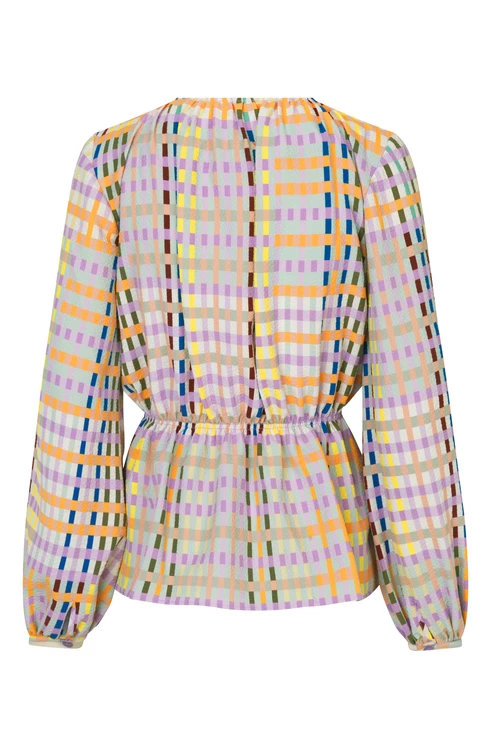 Karin Blouse in Techno Check. Elegant flowy peplum blouse with puffed long sleeves, closeable v-neck and an elasticated waist. Made of a Recycled Polyester blend. Pair with the Marc Pants in Techno Check.