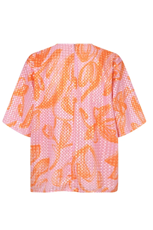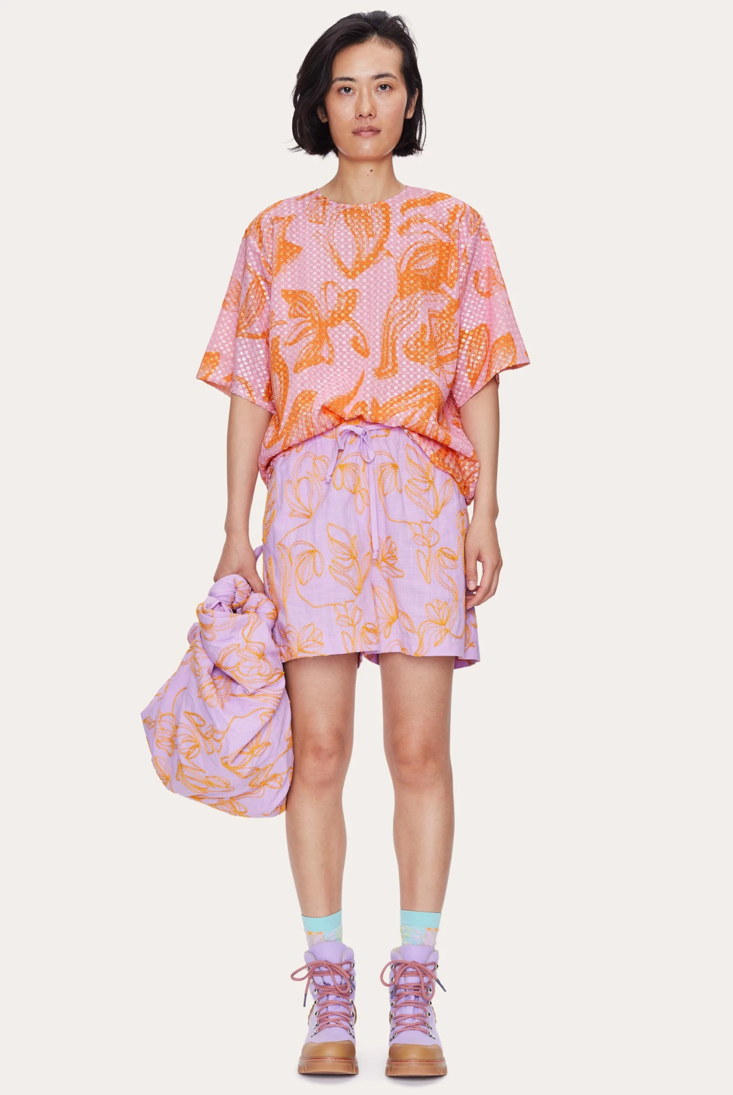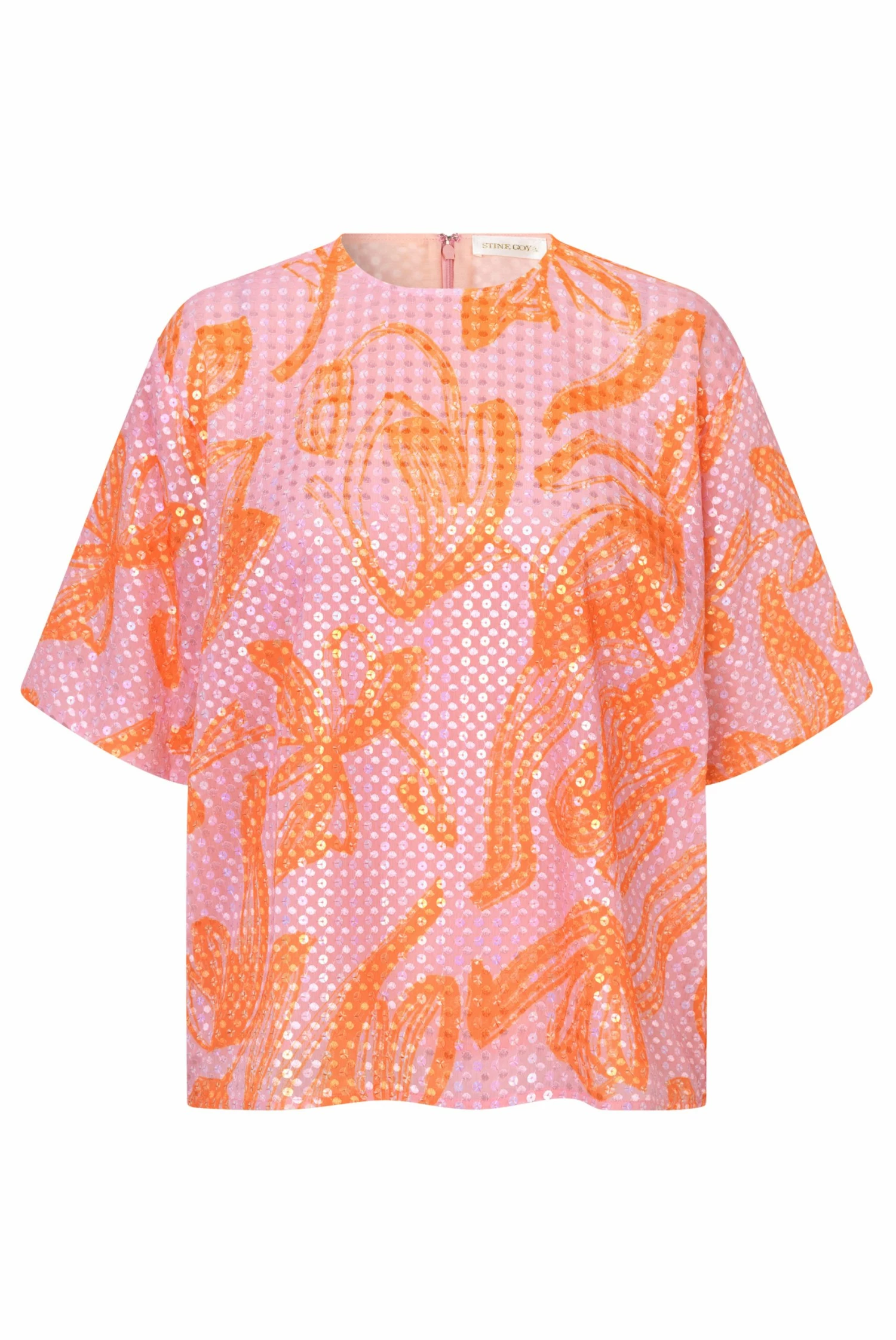 Katalindi T-shirt in Stroke Flower. Classic boxy t-shirt style top with wide short sleeves and zipped crewneck. Detailed sequinned material. Fully lined. Pair with the Danika Shorts in The Life of a Tulip Lilac.