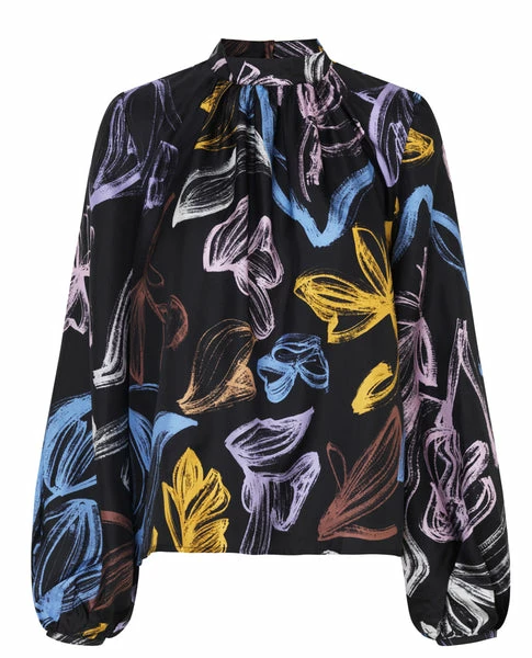 Stine Goya Leana Tulips Blouse, a black silk blouse with long voluminous sleeves and a high neck. Covered in a lilac, blue, burgundy and yellow floral print the Leana top is loose fitting with gathered cuffs. 100% Silk Hand wash Model is 176cm and wears size XS – UK8 Measurements for size small: Chest 110 cm Bottom width 118 cm Sleeve length 67 cm Full length 63 cm XS – UK8, S – UK10, M – UK12, L – UK14 Stine Goya is very generously sized so we would recommend sizing down.