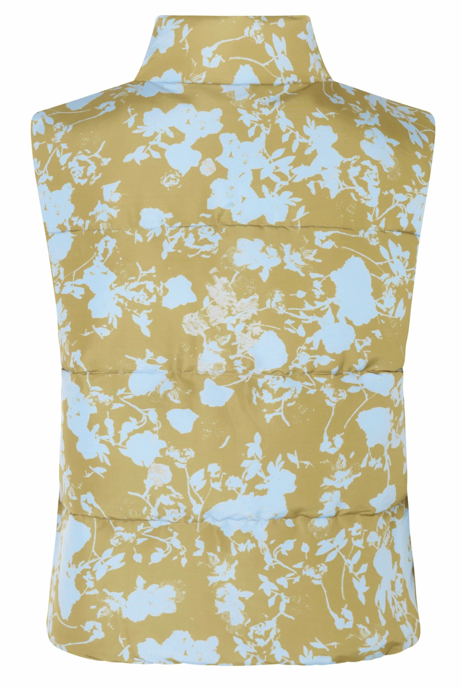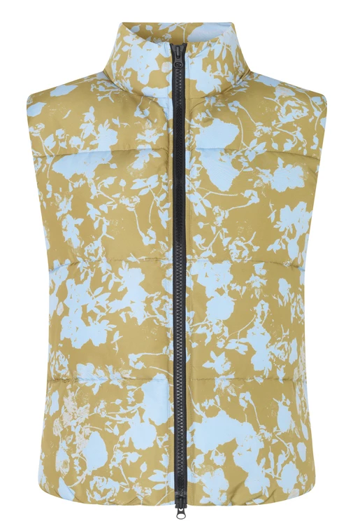 Leonor Vest in Flower Foliage Blue. Puffer vest with hidden side pockets and front zipper. All over pattern. Made of Recycled Polyester blend.