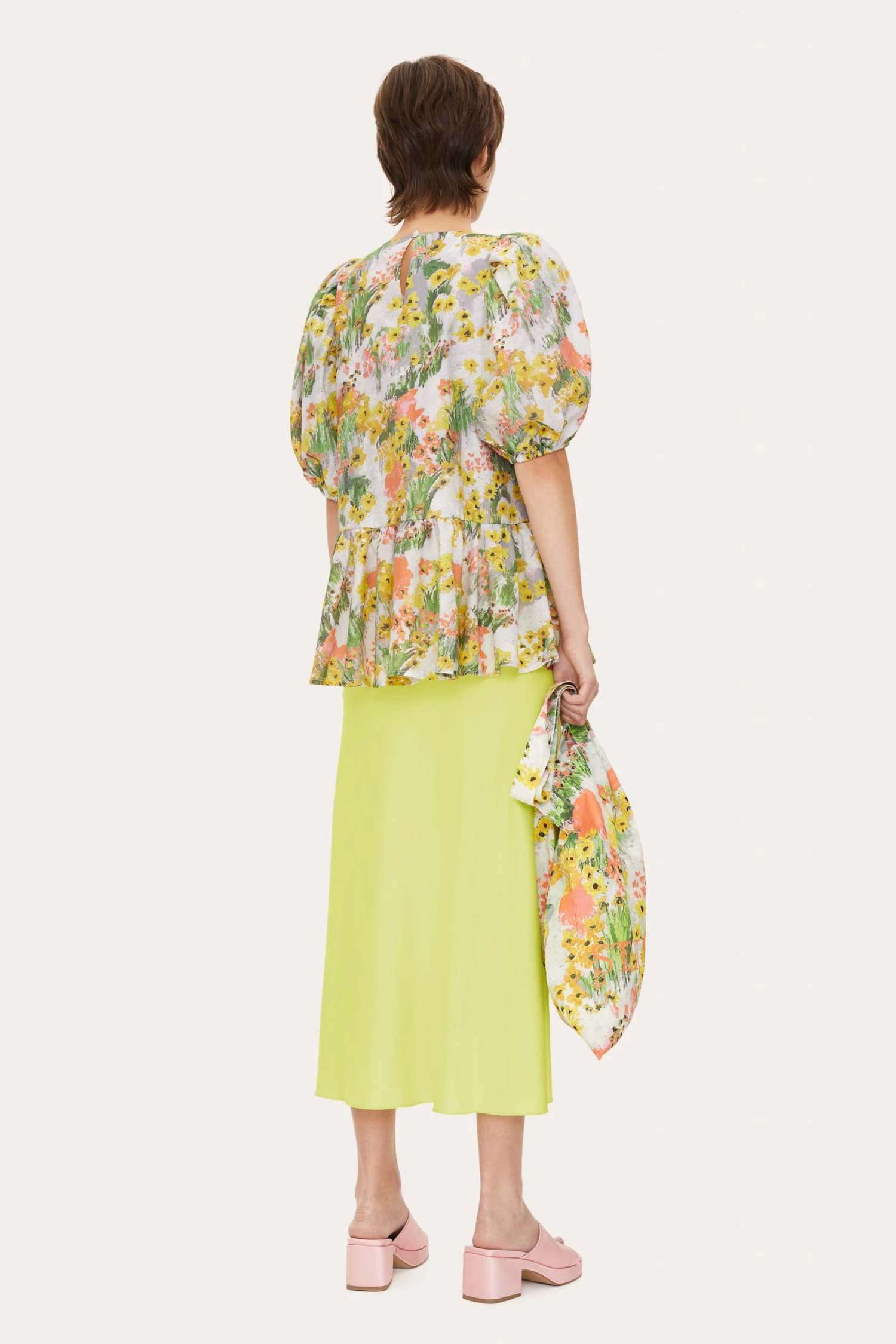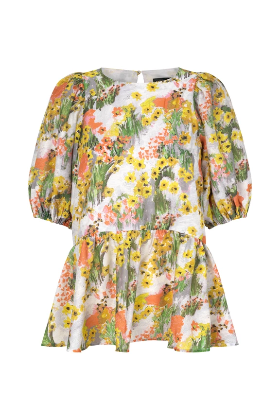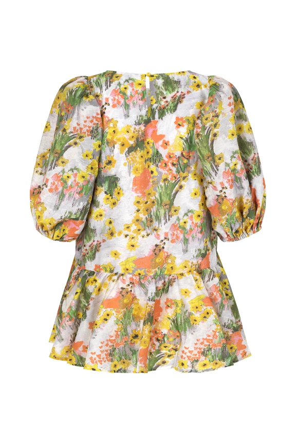 Liw Blouse in Artist Canvas Daytime. Classic peplum top with high-low waistline, crewneck with button closure and puffed short sleeves.