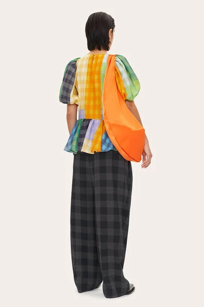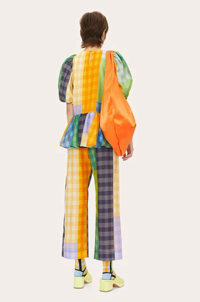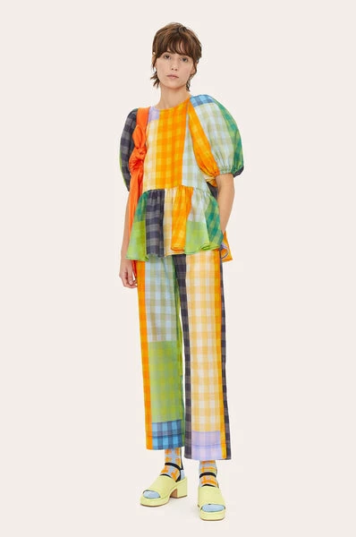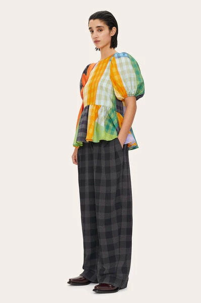 The Liw Blouse in Picnic Check is a relaxed fit blouse with high-low peplum silhouette and voluminous half sleeves. The standout of course is the fantastic colour combination used in the patchwork checked pattern. Pair with the matching Debra Pants for full-on impact or let the top do the talking with a plain pair of linen trousers. Model is 176cm tall and wears a size XS XS S M L Pit to pit (cm) 44 46 48 50 Sleeve (cm) 35 35 36 37 Total length (cm) 63 64 65 66 39% Tencel, 34% Lenzing Ecovero Viscose, 20% Polyamide, 7% Linen Machine Wash This product is RESPONSIBLE. Social and environmental responsibility is an evolving goal at Stine Goya: LENZING™ ECOVERO™ Viscose fibres are a green alternative to regular Viscose, generating significantly lower emissions and water impact.These fibres are derived from sustainable wood sources and are certified with the recognized EU Ecolabel. They meet high environmental standards throughout their full lifecycle – from raw material extraction to production, distribution and disposal. Made in China SG4239 3010