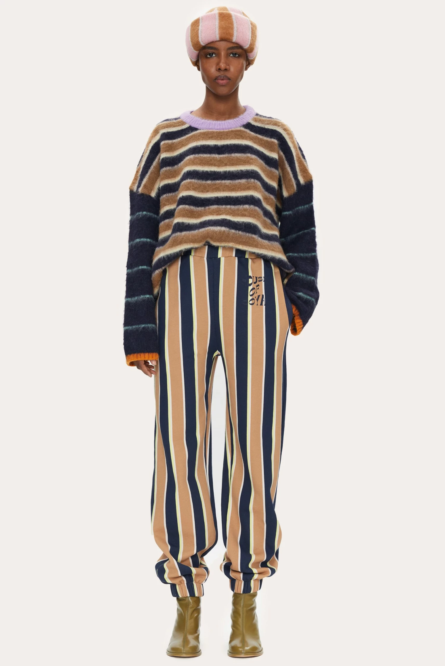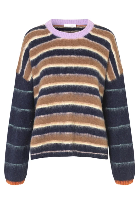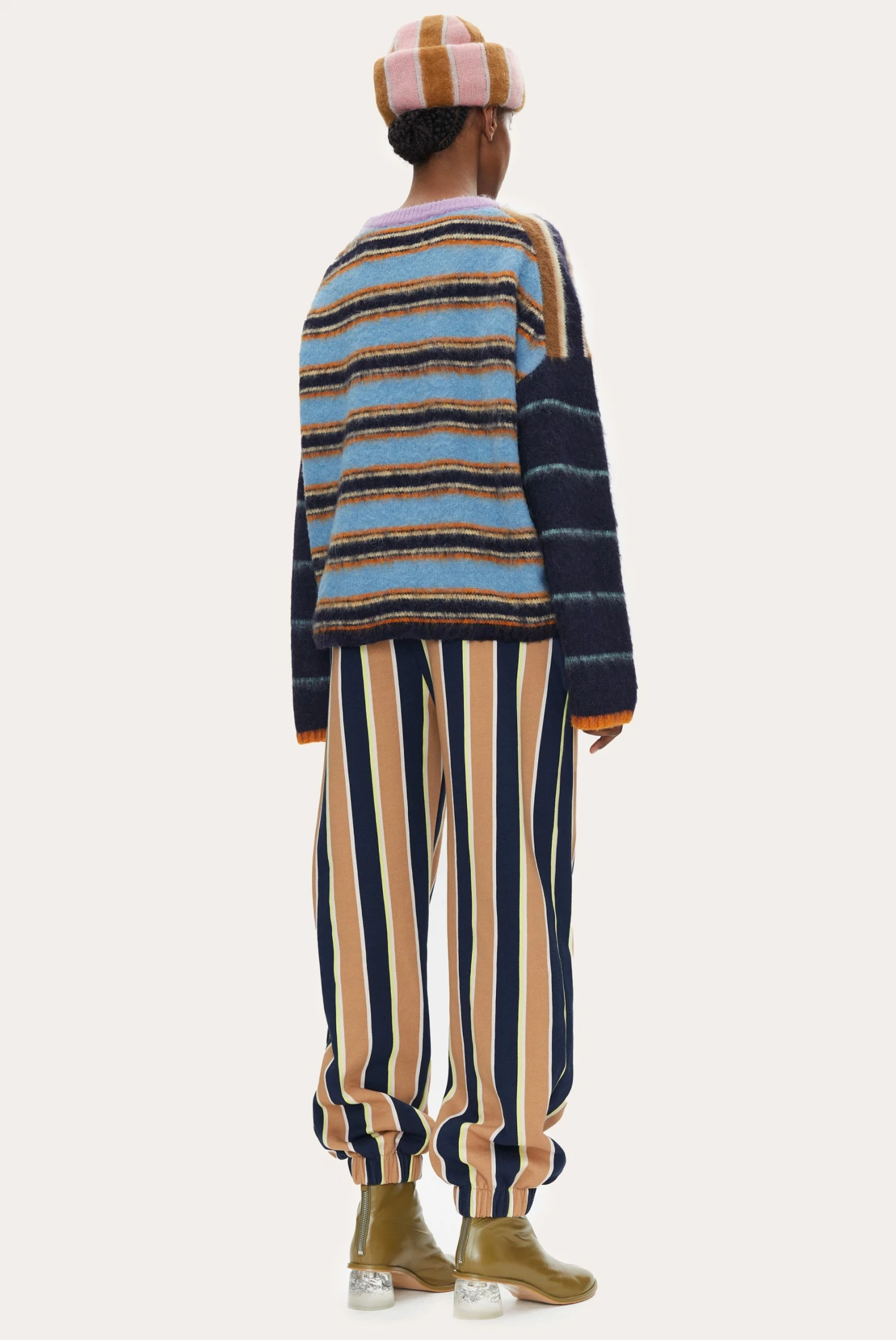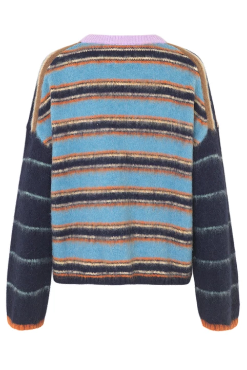 Lucs Knit Sweater in Stripes Multi. Oversized knit sweater with striped colour blocked pattern. Long relaxed fit sleeves and crewneck. Pair with your favourite pants or skirt from the collection.