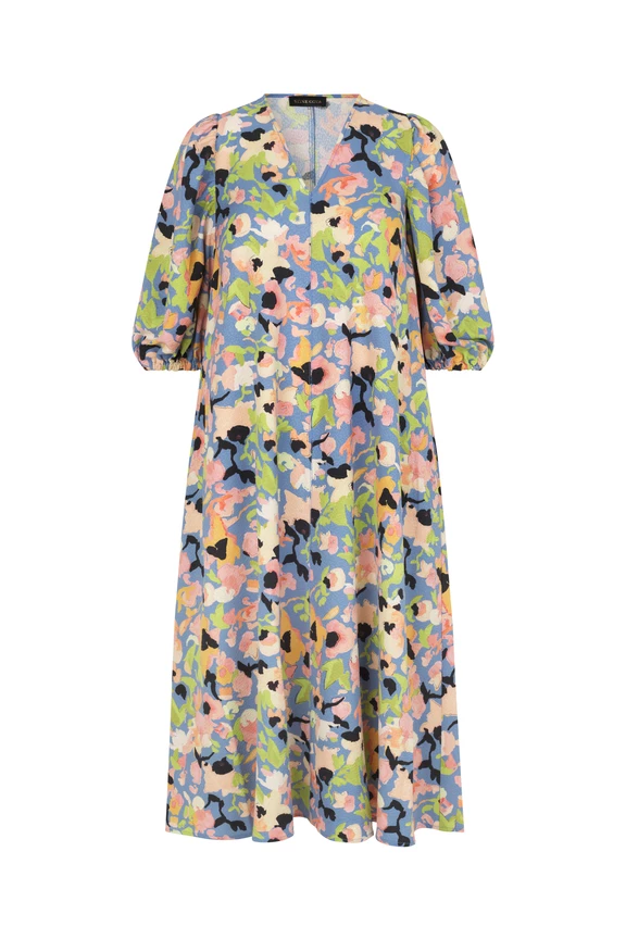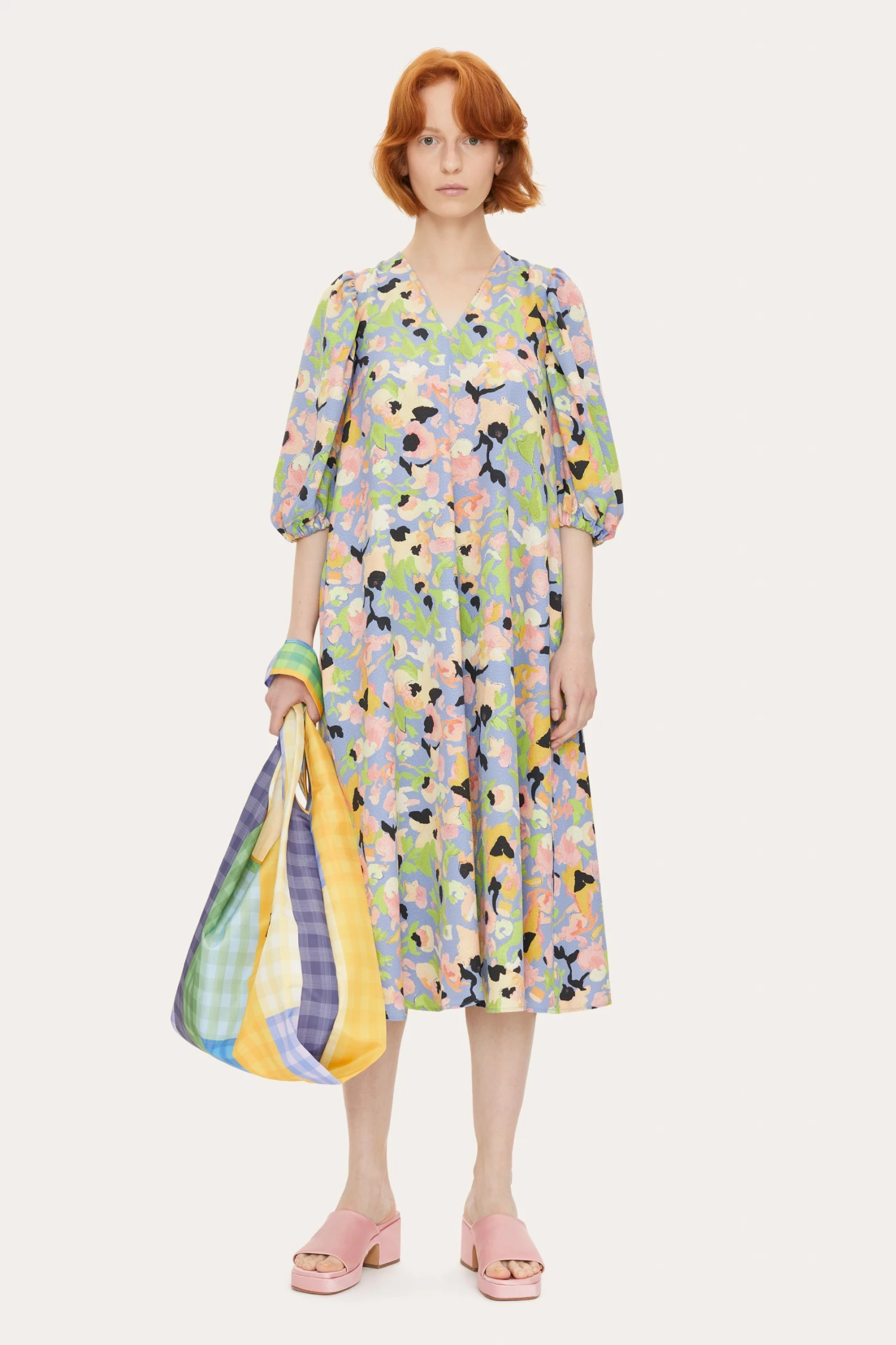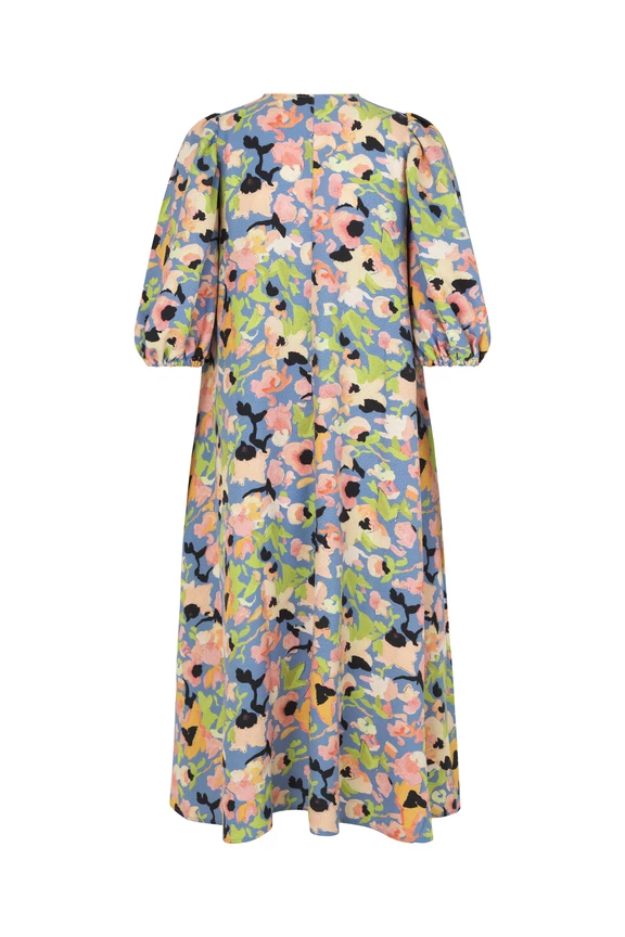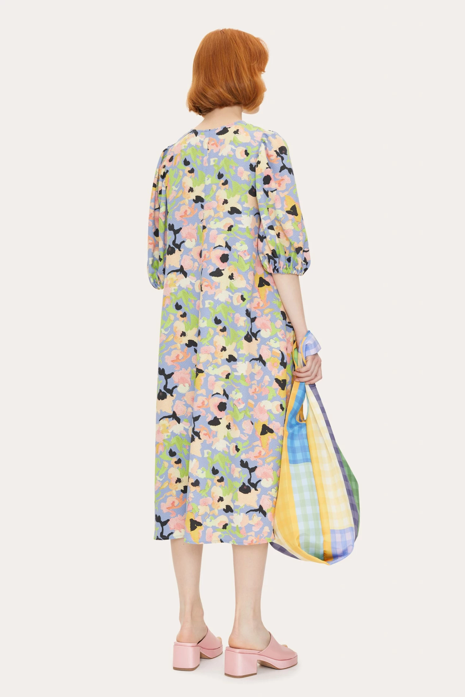 Mavelin Dress in Teatime Floral. Bouncy oversized mid-length dress with floral pattern and puffed short sleeves. Recycled Polyester blend. Pair with your favourite bag from the collection.