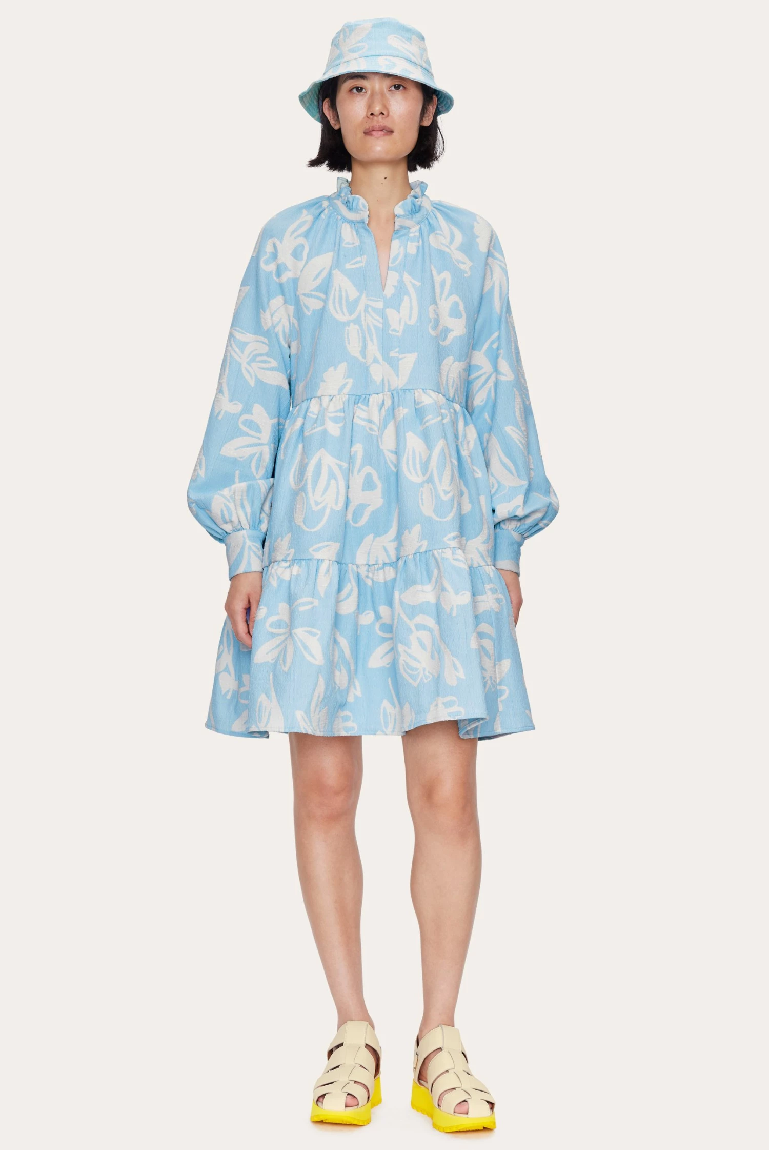 Merina Hat in The Life of a Tulip Blue. Classic bucket hat with all-over floral pattern. Made of a lightweight cotton blend.