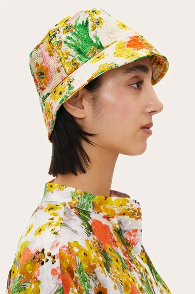 The Merina Bucket Hat in Artist Canvas Daytime takes bucket-hatting to the next (extremely chic) level! The bright fabric with a metallic floral pattern and stitched brim is made from a recycled polyester blend and will finish off any summer outfit. Recycled Polyester is a green alternative to virgin Polyester, made from recycled plastics. Making garments from Recycled Polyester requires less energy, prevents plastic bottles from becoming landfill and produces less pollution. 78% Recycled Polyester, 12% Metallic, 10% Nylon One Size: XS/S, Brim is 5cm, circumference is approx. 54cm Dry clean only, do not wash Made in China SG4320 3024