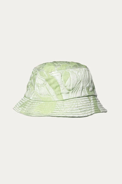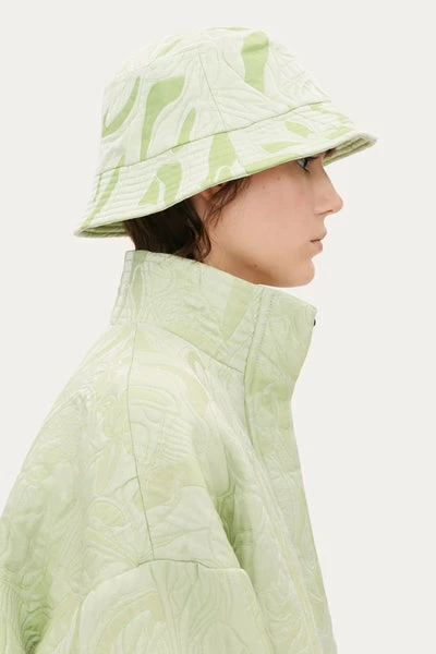 Merina Bucket Hat in Shiso Mint. Simple bucket hat with an all over plush and sheened quilted material. Mid length stitched brim. ONE SIZE 100% POLYESTER