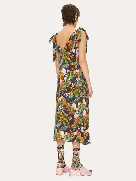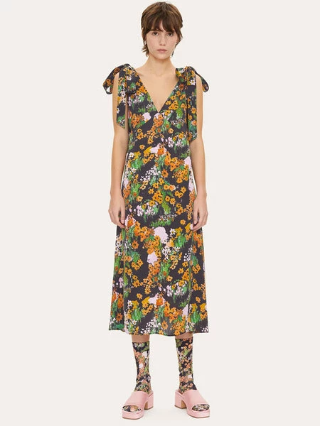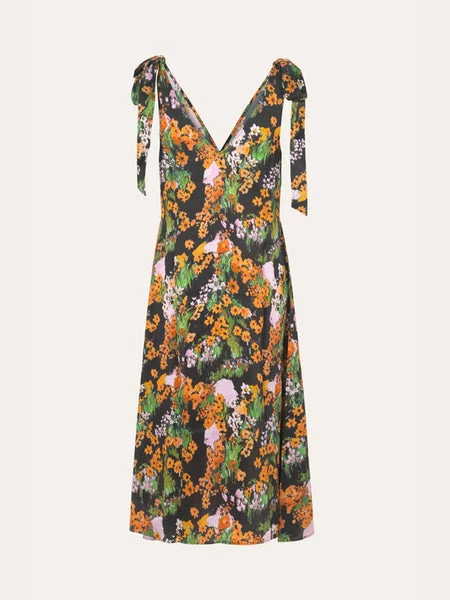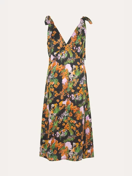 Adorned in a dark floral pattern, the Naima Dress by Stine Goya has an A-line silhouette, adjustable tie straps and a plunging V-neckline. This feminine piece falls to mid-calf length; layer over t-shirts and pair with sandals for a low-key look. Size Small: Chest 96cm, Waist 92cm, Full Length 119cm. Adjustable tie straps V-neck and back A-line silhouette Midi length Sleeveless Floral pattern Composition: 54% Lenzing™ Lyocell, 46% Viscose. Care: Handwash. Iron on a low heat. Do not tumble dry.
