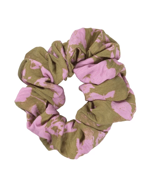 Stine Goya Pink Flower Scrunchie, a green and pink floral print fabric hair tie made from a lightweight and stretchy modal. 88% Modal & 12% Polyamide Hand wash